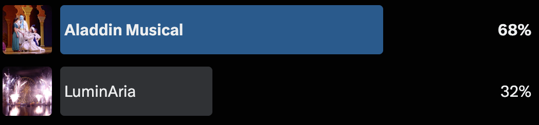 Before we get into today's matchup, let’s take a look at the previous poll's results. Aladdin: A Musical Spectacular flew high above LuminAria to claim its spot in the Final Four.