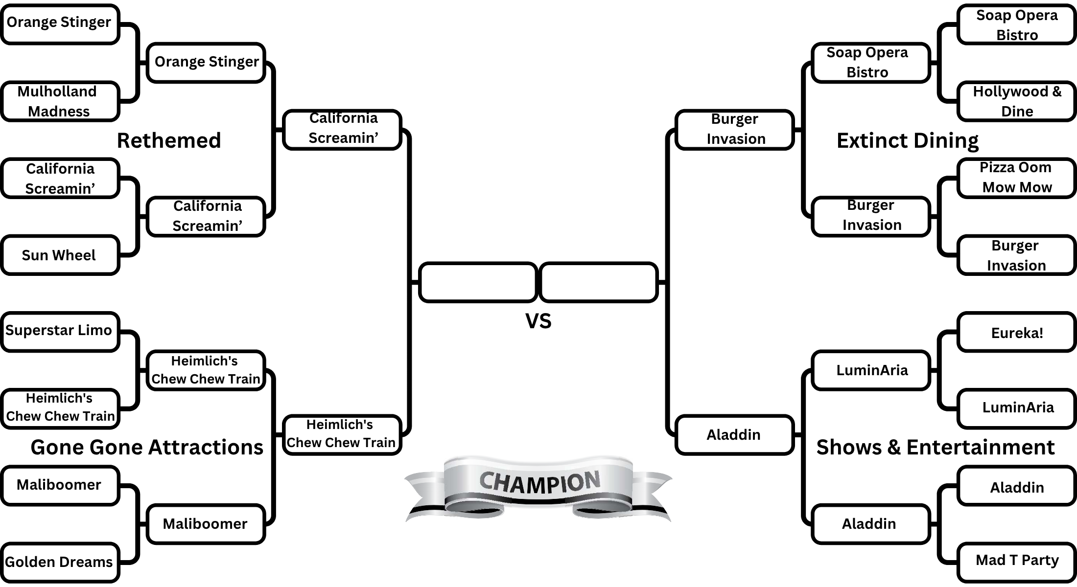 Speaking of the Final Four, today, we kick off that round with a matchup between two former DCA rides. From the Rethemed Region, we have California Screamin'. And from the Gone Gone Region, it's Heimlich's Chew Chew Train.