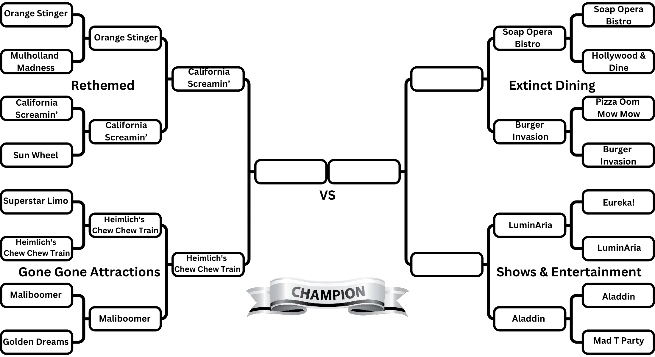 Welcome to the opening round of our 12th annual Mouse Madness tournament! This year, we are celebrating the 25th anniversary of Disney('s) California Adventure by putting extinct DCA offerings against each other. We have created a bracket of 16 former features in four different regions — and now, one by one, we will narrow them down until we determine what was the best part of the park's past.
