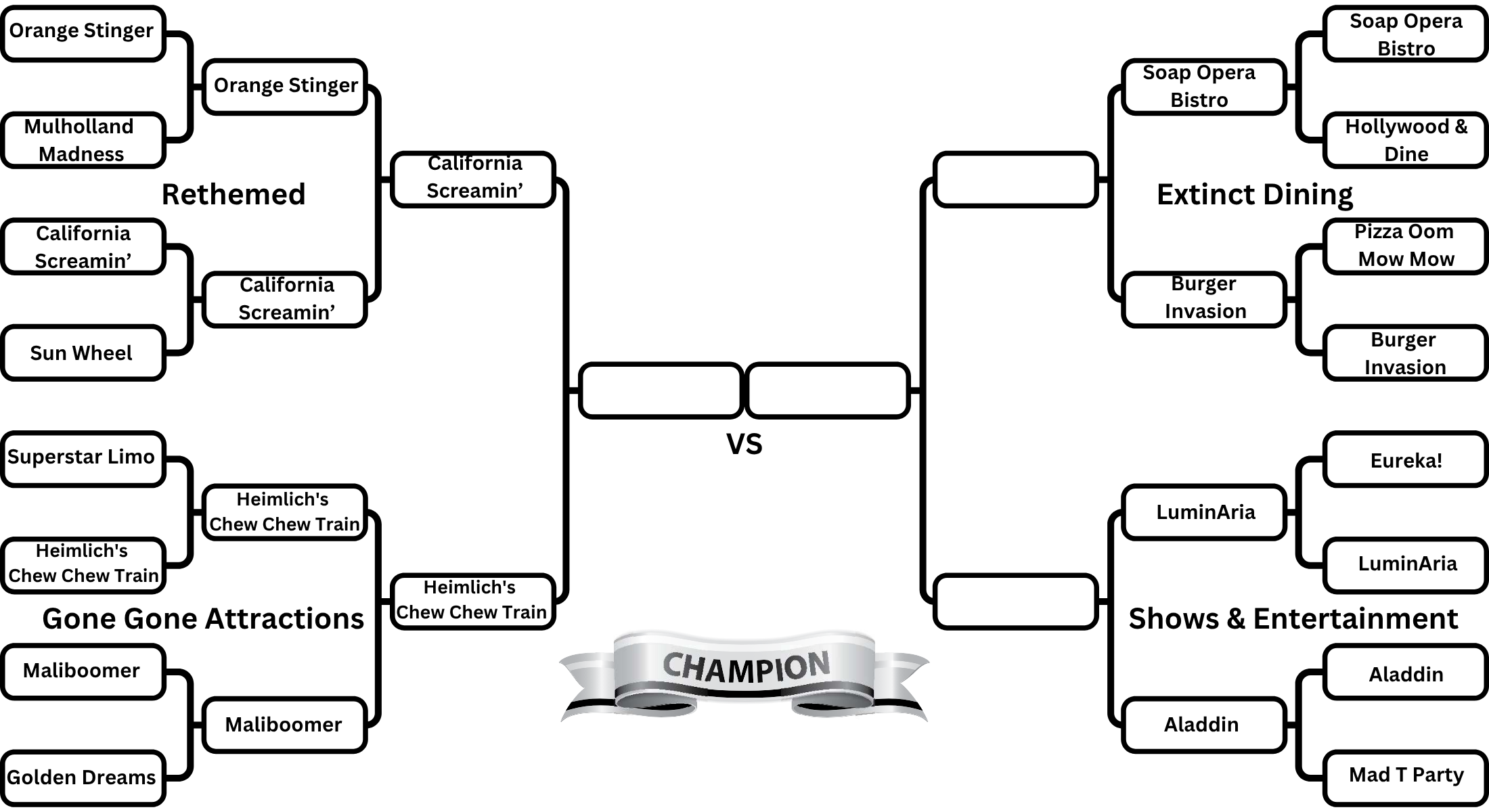 Welcome to the opening round of our 12th annual Mouse Madness tournament! This year, we are celebrating the 25th anniversary of Disney('s) California Adventure by putting extinct DCA offerings against each other. We have created a bracket of 16 former features in four different regions — and now, one by one, we will narrow them down until we determine what was the best part of the park's past.