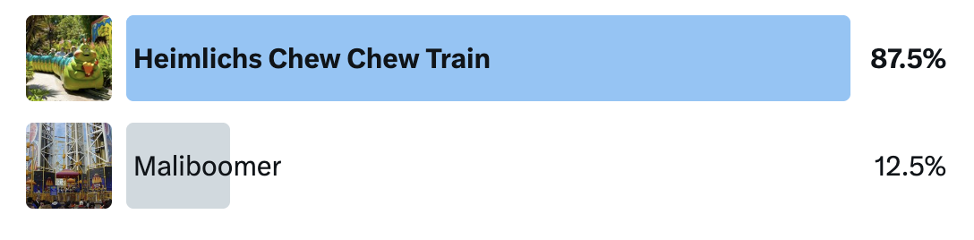 Before we get into today's matchup, let’s take a look at the previous poll's results. Heimlich's Chew Chew Train ate up the Maliboomer like a burrito (or a Malibu-Rito, since DCA used the same city pun twice).