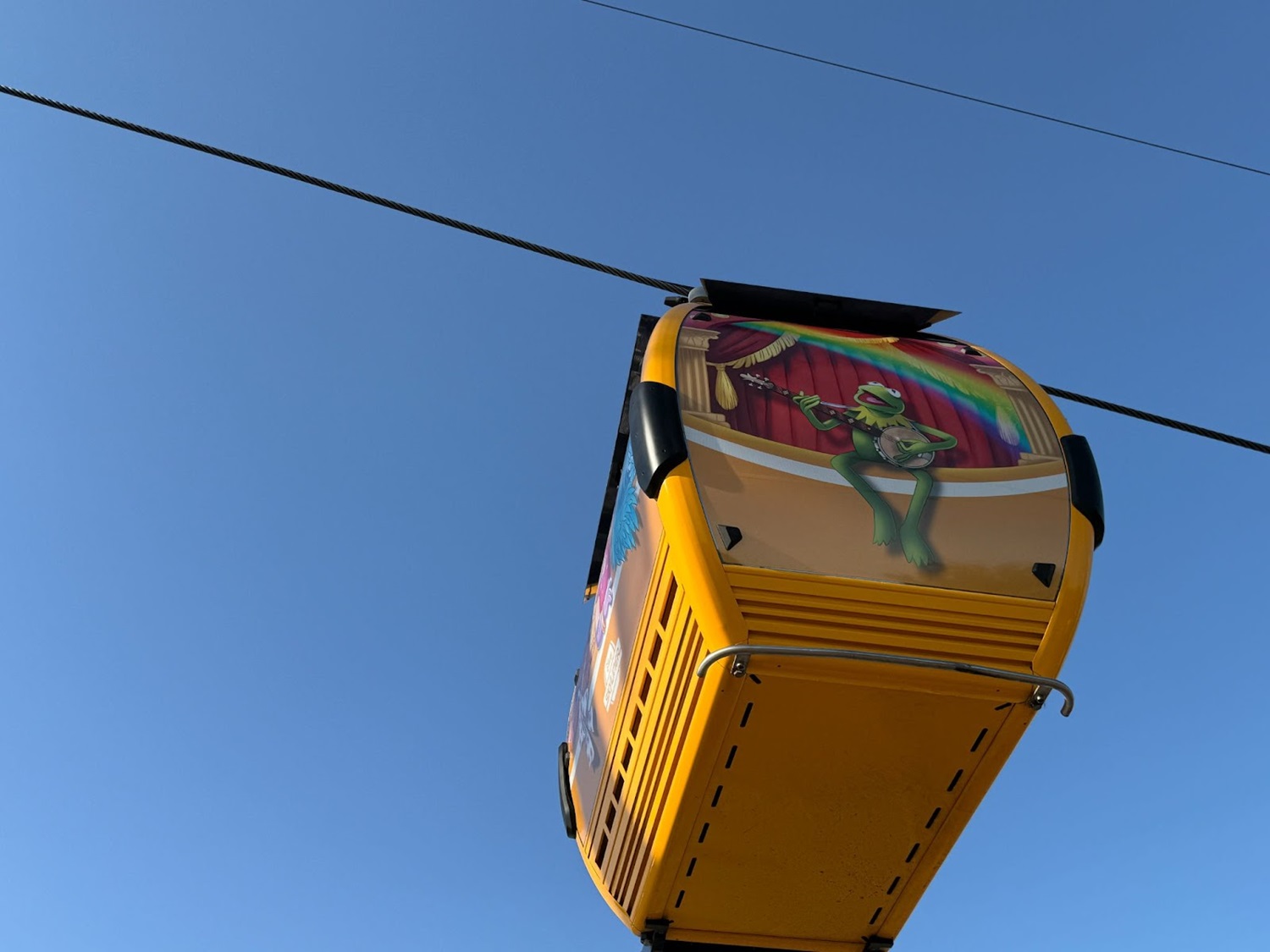 The bright yellow gondola showcases beloved Muppet characters looking down on you from the windows.
