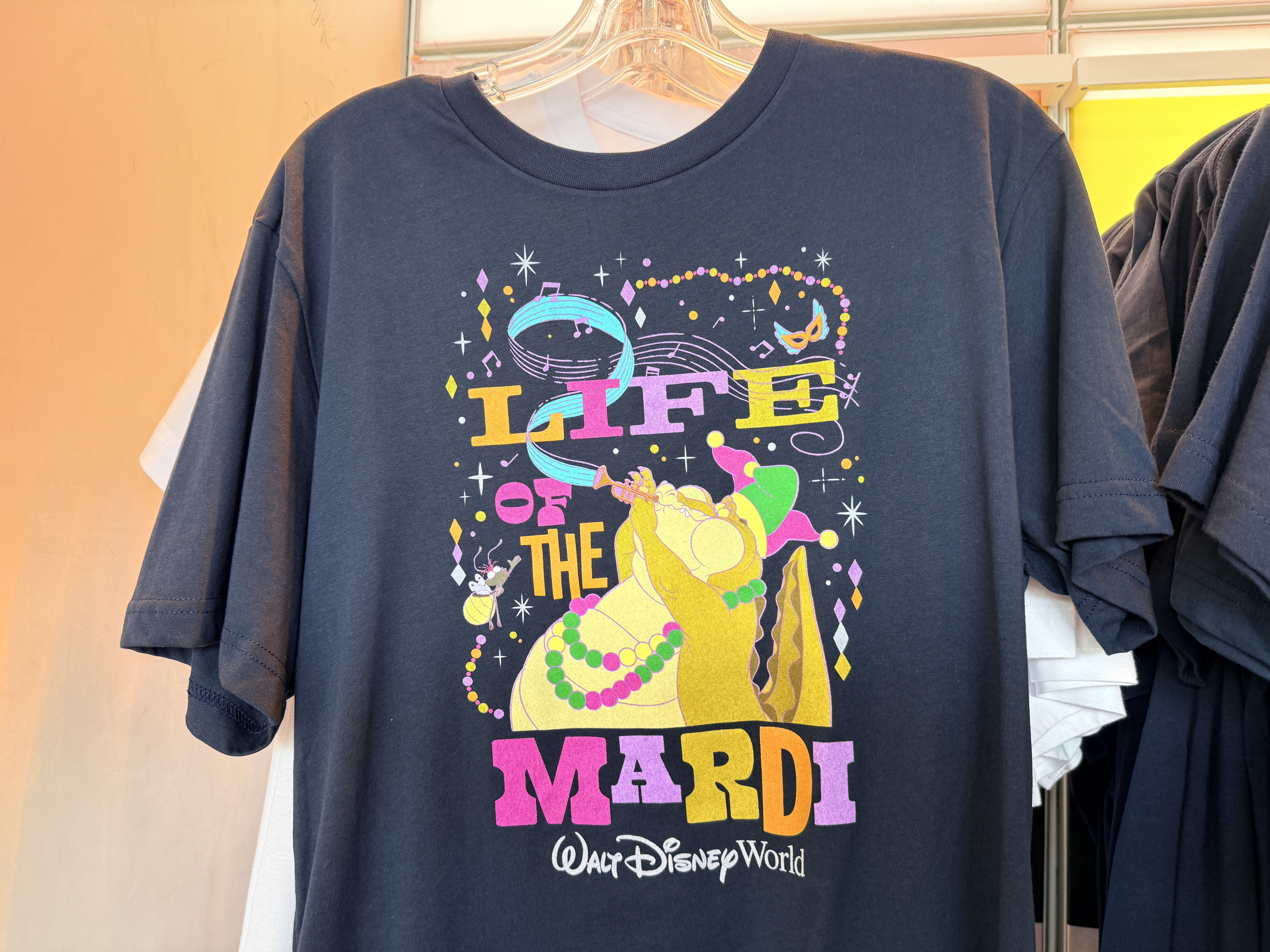 The Princess and the Frog's Ray and Louis are featured on a Mardi Gras-themed shirt.