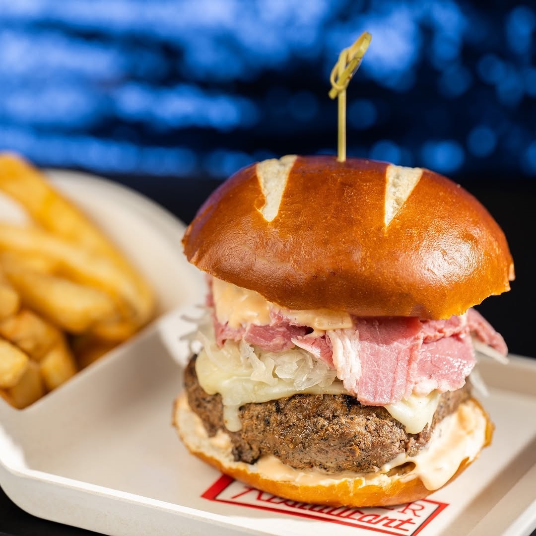 - New Feature Film Burger: Our signature blend of beef topped with sliced corned beef, Swiss cheese, and house-made sauerkraut served on a pretzel bun