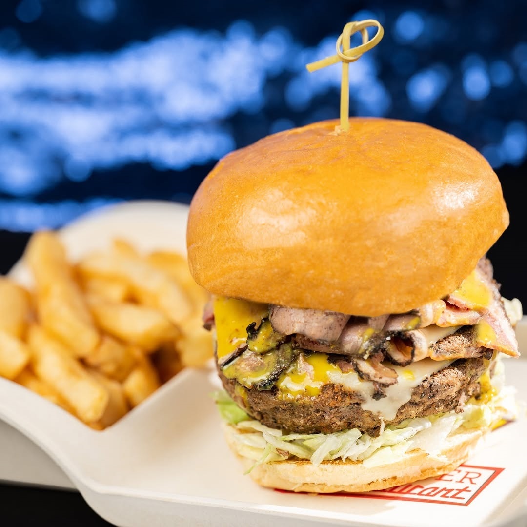 - Cyborg-er: Our signature blend of beef topped with griddled pastrami and pepper jack, lettuce, and heirloom tomato drizzled with house-made Carolina mustard sauce