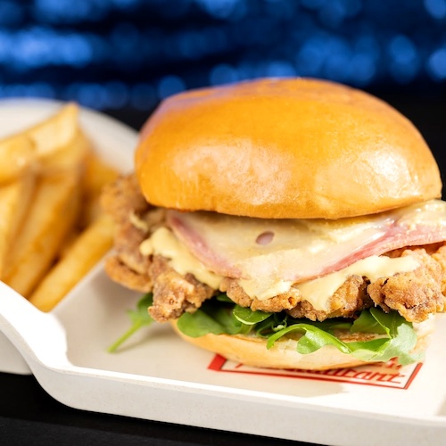 - Fried Chicken Cordon Bleu Sandwich: Fried chicken thigh topped with ham and melted Swiss cheese on a bed of arugula with our signature maple dijon served on a brioche bun