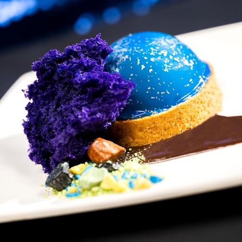 - Cerulean Moon: Chocolate mousse dome with strawberry filling on a graham cracker tart with a hibiscus sponge, green space dust, and chocolate-caramel sauce