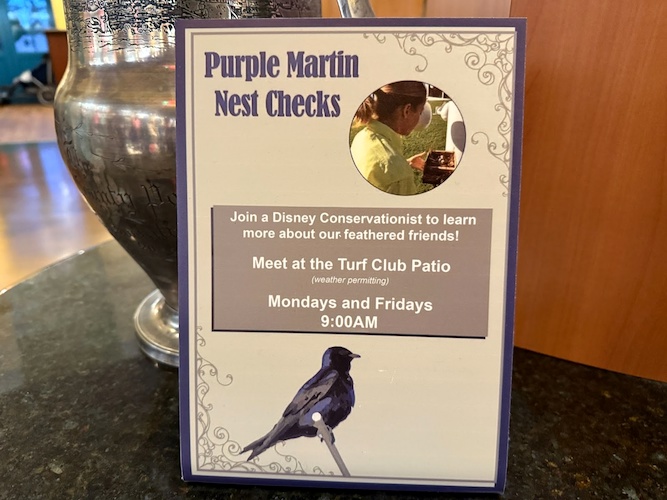 - Taking place at 9AM on Mondays and Fridays, guests are invited to learn more about the study of purple martins and the ongoing efforts to protect them.
