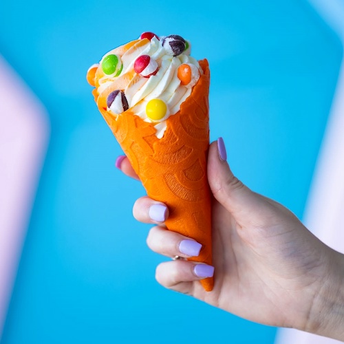 - Totally Orange: Orange and vanilla soft-serve swirl in an orange cone topped with SKITTLES POP'd Freeze Dried Candy