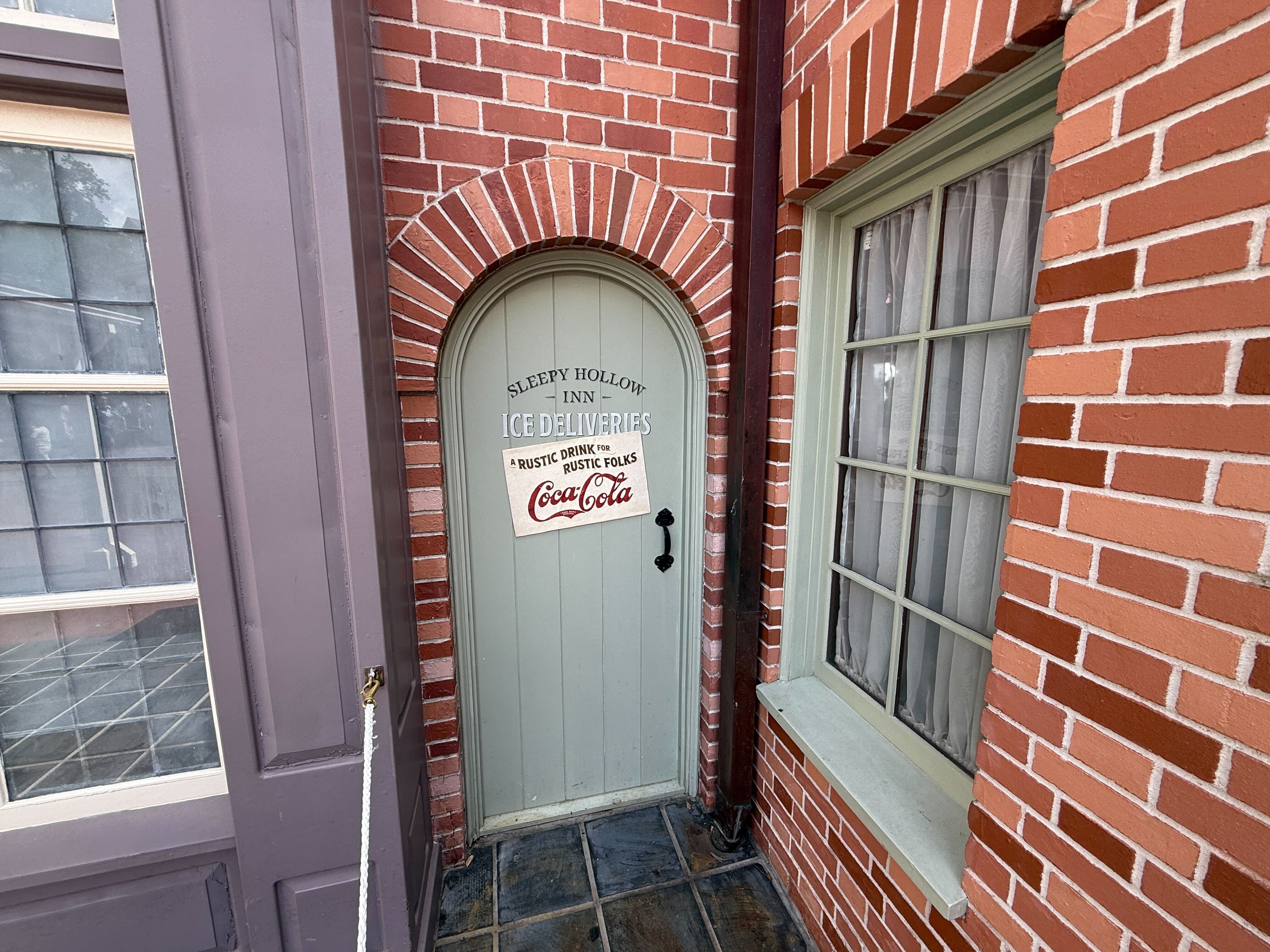 Following the installation of new signage for the restaurant itself last year, a themed door has received new signage reflecting the location's Coca-Cola sponsorship. The door is set aside for Ice Deliveries to Sleepy Hollow, with a Coca-Cola sign on top saying "A Rustic Drink for Rustic Folks."