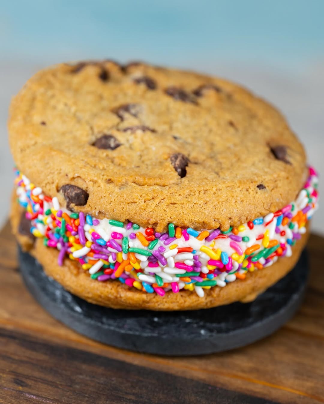 - Vanilla soft-serve sandwiched between two chocolate chip cookies and rolled in chocolate sprinkles or rainbow sprinkles