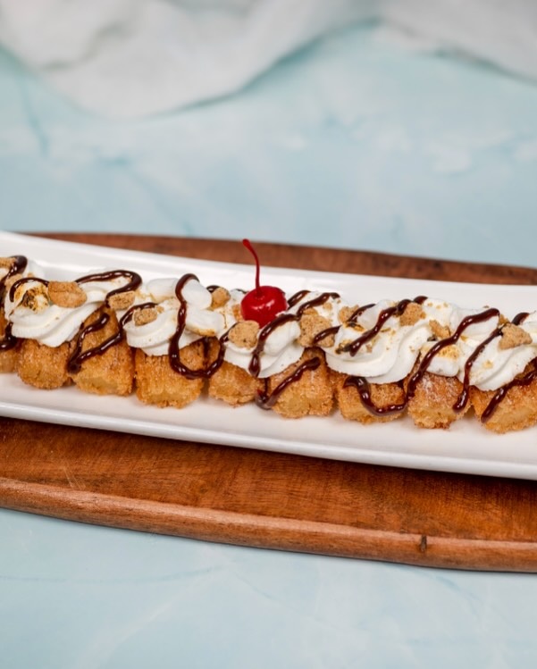 - Churro pieces topped with graham cracker crumbs, marshmallow whipped cream, chocolate sauce, and toasted mini marshmallows
