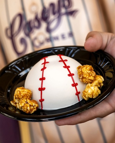 - Baseball Brownie topped with caramel corn mousse and dulce de leche coated in white chocolate at Casey's Corner