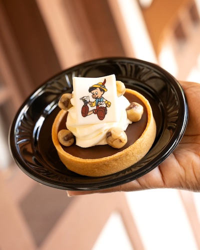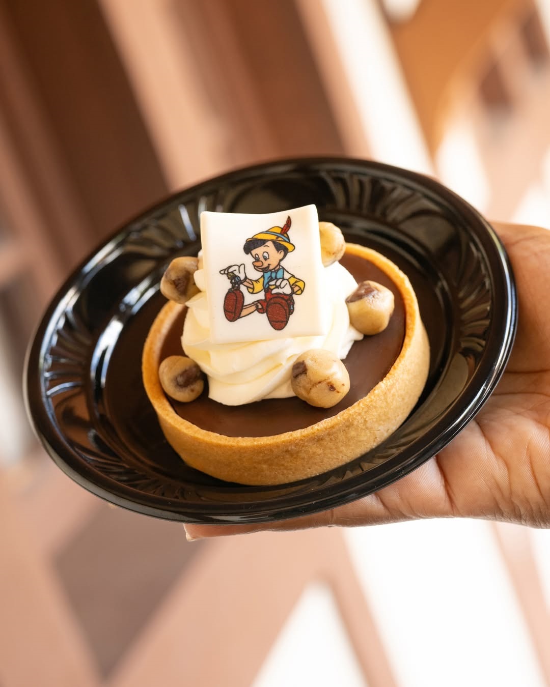 - Pinocchio Cookie Tart filled with chocolate ganache, topped with chantilly cream, cookie dough crumbles, and a chocolate piece at Pinocchio Village Haus
