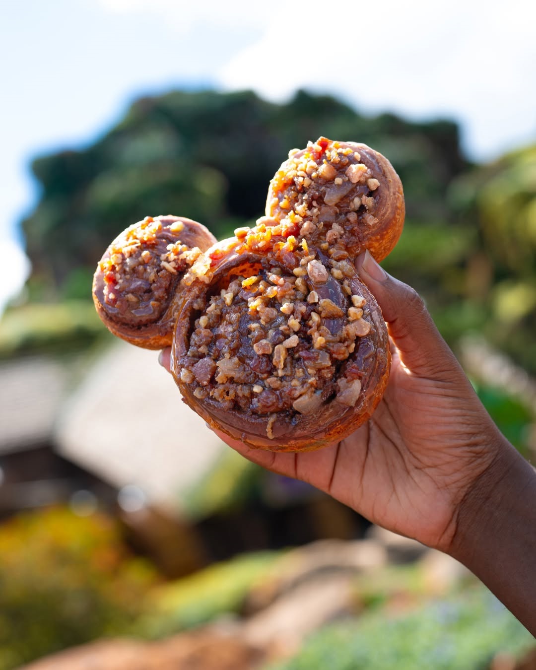 - Mickey-shaped Bacon-Pecan-Caramel Cinnamon Roll topped with bacon pieces, candied pecans, and caramel sauce at Westward Ho