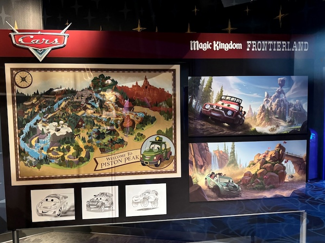Finally, we come to Piston Peak — which is the Cars area racing to Magic Kingdom. As previously announced, this sub-section of Frontierland will take inspiration from National Parks. In turn, Disney has introduced a new Ranger character named J. Autobahn Woodlore, paying homage to J. Audubon Woodlore who appeared in several animated shorts alongside the likes of Humphrey the Bear and Donald Duck. This character can be seen in the corner of the map on display.