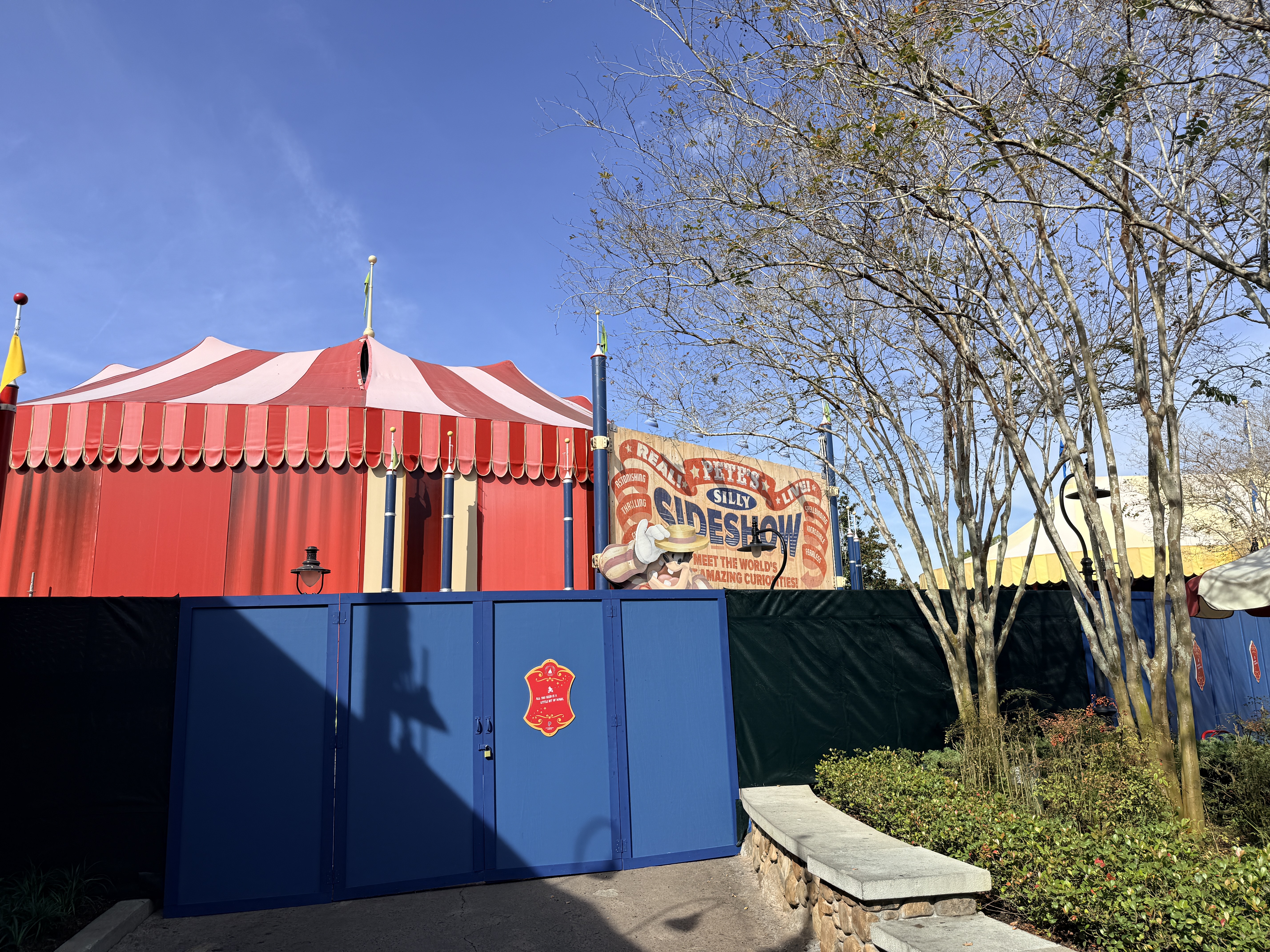 Pete's Silly Sideshow itself is now surrounded by construction walls, as Disney looks to fix many of the obvious wear and tear issues to the tent structure.