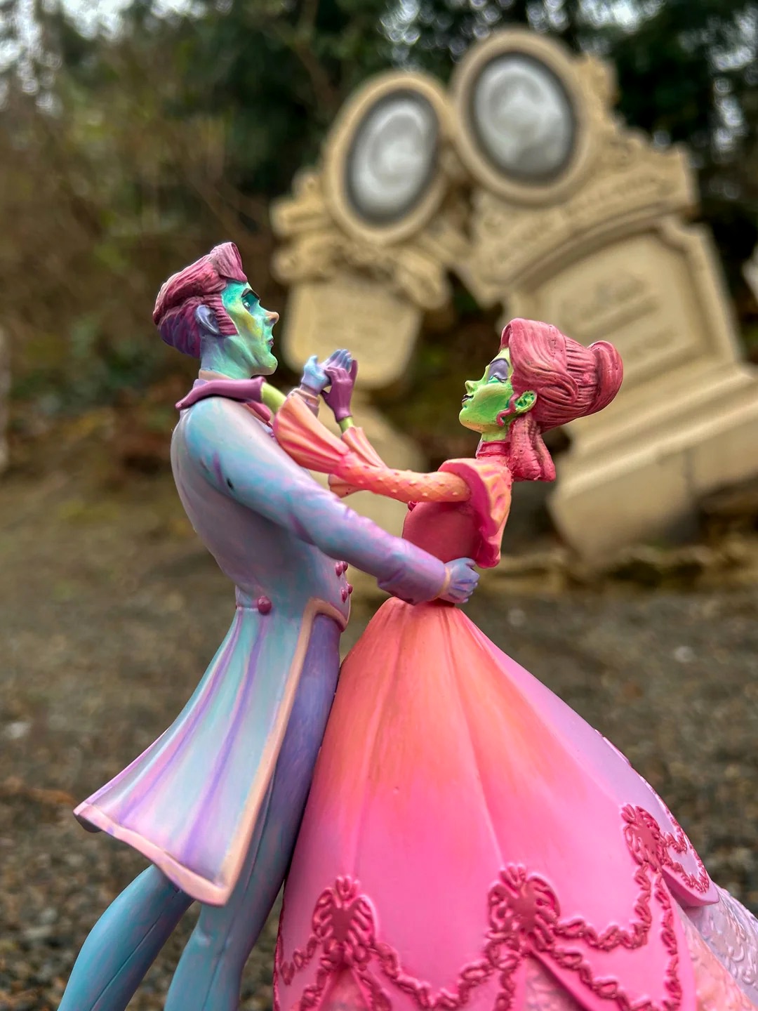 • Designed by the artistic duo Kevin and Jody, the figurine depicts the ghostly couple locked in an eternal waltz. Their flowing costumes and delicate movement evoke the swirling spirits that haunt the manor’s infamous wedding festivities, while the rotating musical base adds an extra layer of atmosphere, making the piece feel as if it has been lifted straight from the haunted halls of Thunder Mesa.