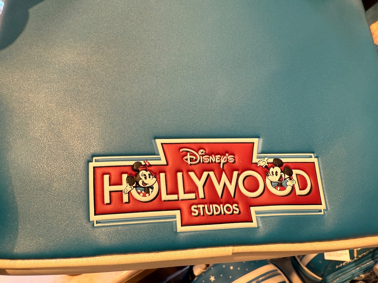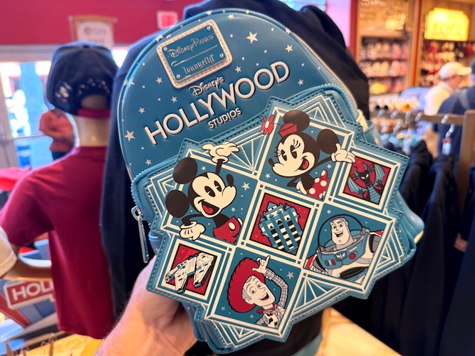 A Loungefly bag features imagery of characters and elements strongly tied to Hollywood Studios, including Mickey & Minnie and Woody & Buzz. It sells for $80.00.