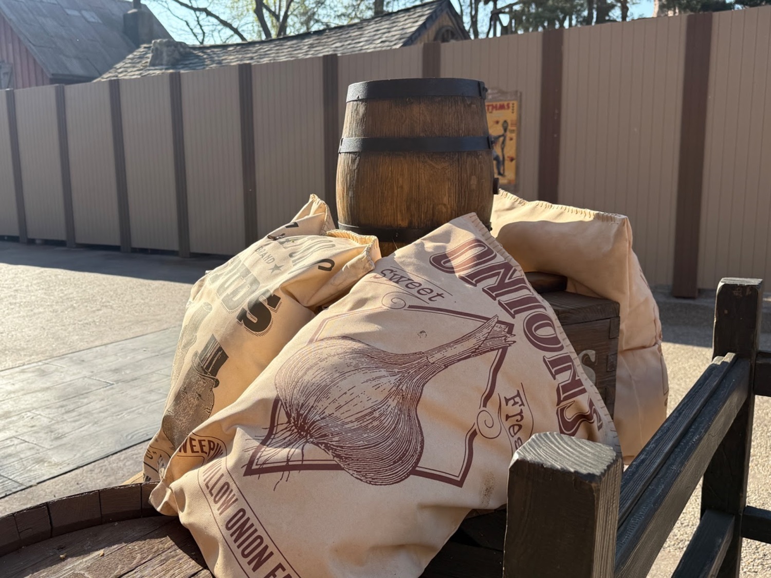The area around Overland Trail Cafe is now filled with a lot of Doritos-logo specific items, including bags and crates, along with additional sacks of items like onions and corn.