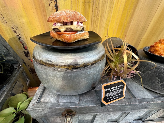 NEW Galactic Gyro Burger (Galactic Grill) – Angus beef and vegetable patty, havarti cheese, feta tzatziki sauce, cucumber, tomato, and red onion on ciabatta.