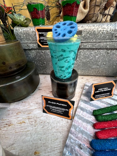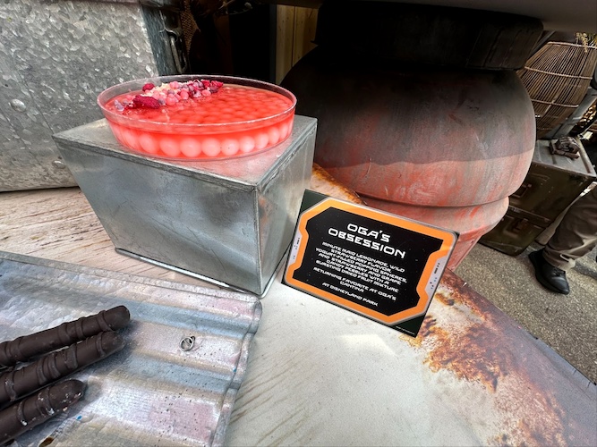 Oga’s Obsession (Oga’s Cantina) – Minute Maid lemonade, wild strawberry flavored yogurt filled popping spheres, and strawberry and grape candle pebbles with dried fruit.