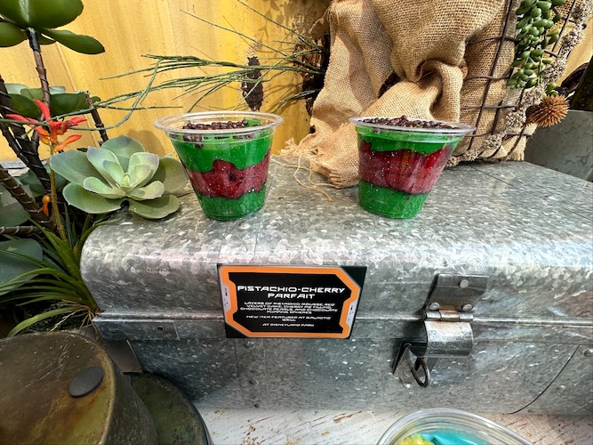 NEW Pistachio-Cherry Parfait (Galactic Grill) – Pistachio mousse, red velvet cake, cherry pie filling layered and topped with chocolate pearls and chocolate popping spheres.
