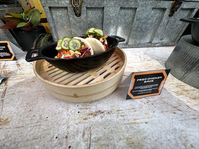 Fried Chicken Baos (Docking Bay 7) – Two crispy chicken baos, sweet chili sauce, scallion salad, and cucumber.