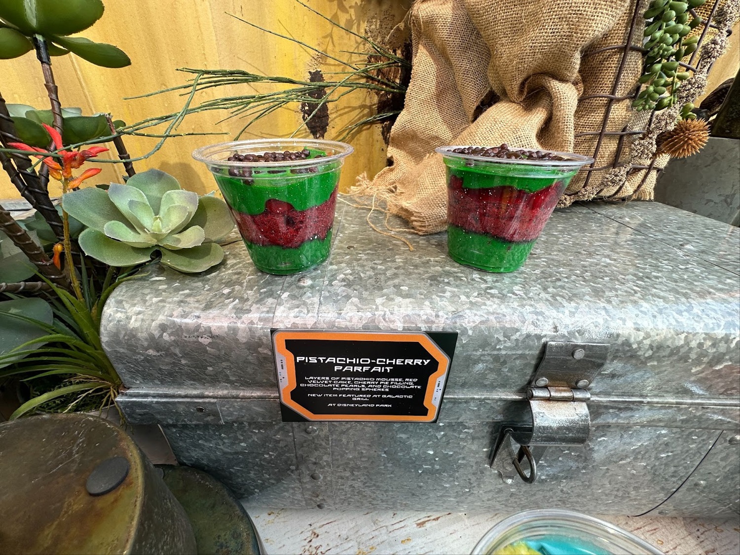 NEW Pistachio-Cherry Parfait (Galactic Grill) – Pistachio mousse, red velvet cake, cherry pie filling layered and topped with chocolate pearls and chocolate popping spheres.