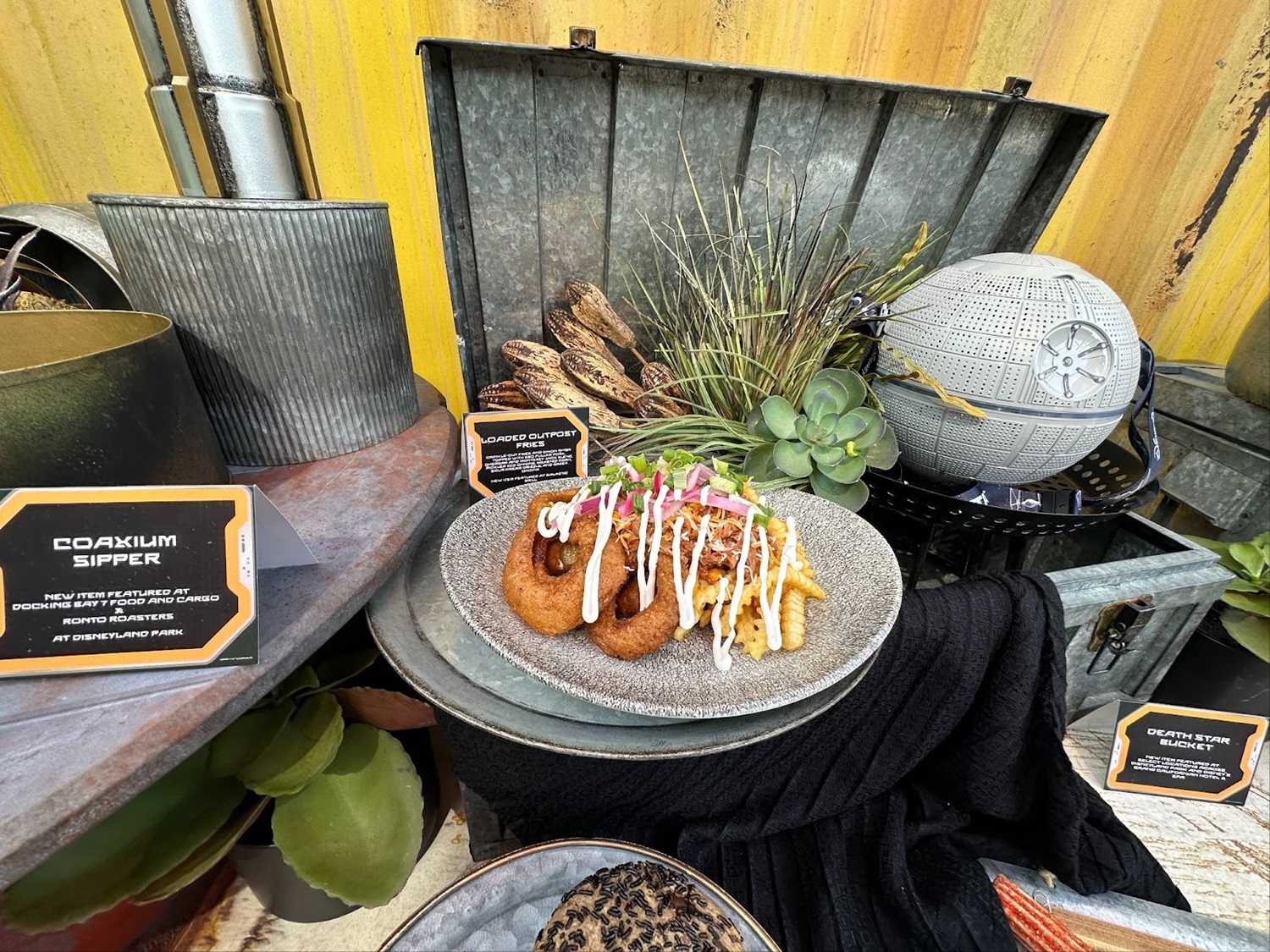 NEW Loaded Outpost Fries (Galactic Grill) – Crinkle cut fries and onion rings, pulled pork, cheddar and monterey jack cheese, pickled red onions, roasted corn, sour cream, and green onions.