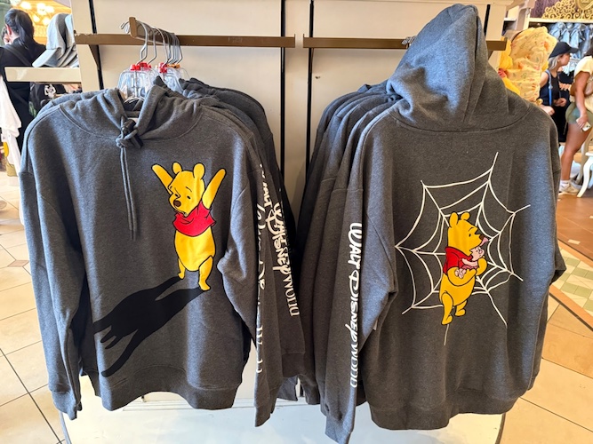 A pullover (Poohover?) hoodie features Pooh and some spooky cobwebs and sells for $69.99.