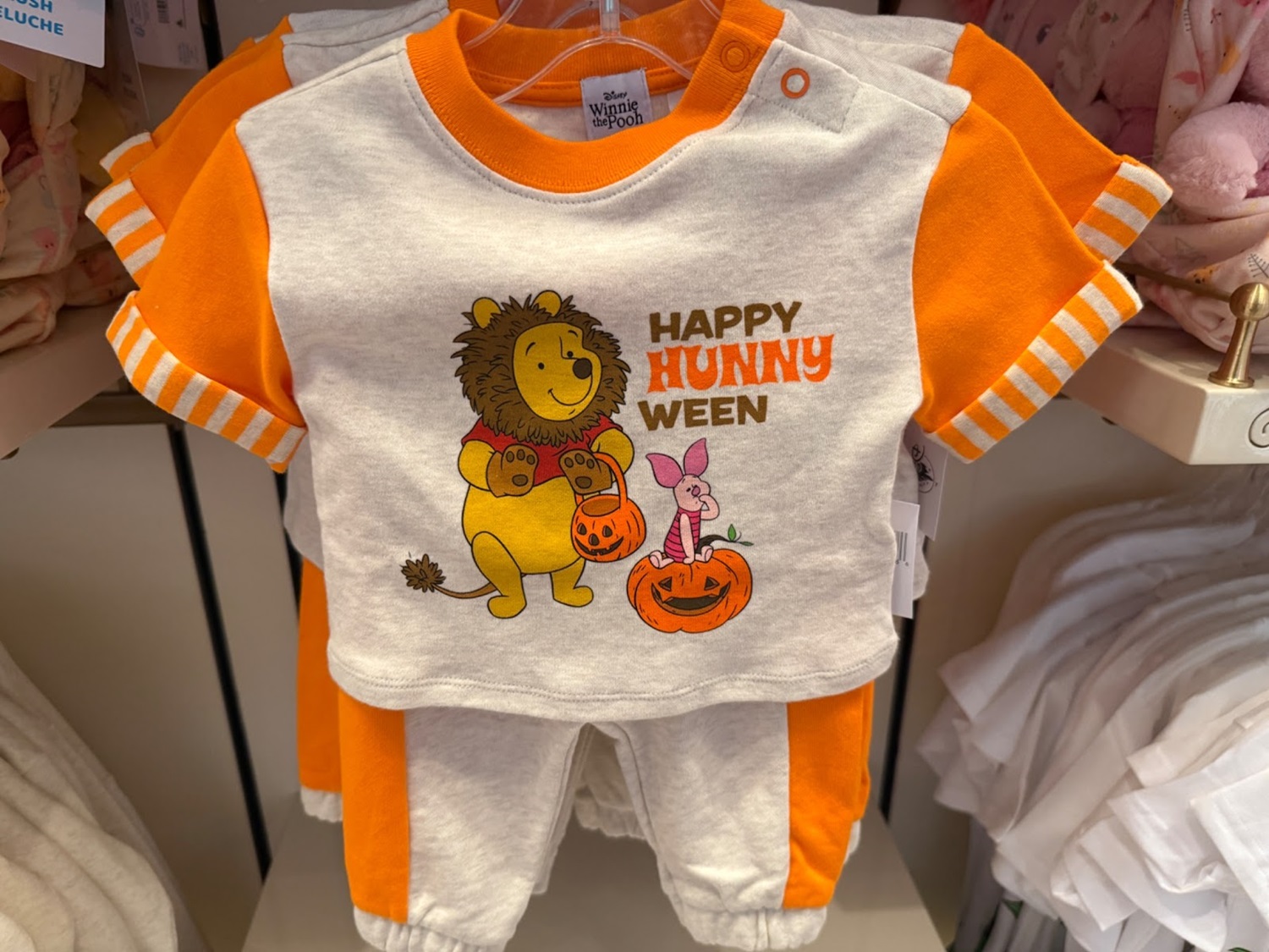 A baby’s outfit featuring Pooh and Piglet getting ready for Halloween is also $39.99.