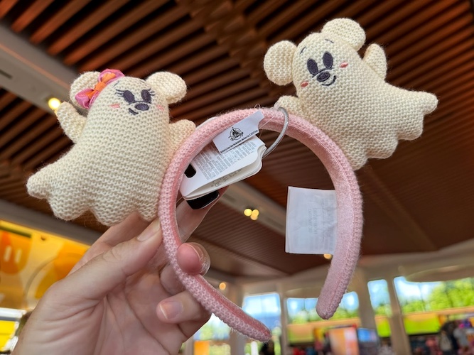 There is a pink ghost ear headband featuring knit ghost versions of Minnie and Mickey Mouse in place of the “ears" with a knit pastel pink headband and pink velour lining along the inside of the headband that retails for $34.99.