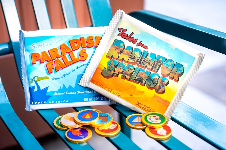 Cars-themed Milk Chocolate with crispy rice stars serve as a postcard of sports to Radiator Springs. Similarly, the Up- themed Coconut Passion Fruit Milk Chocolate sends greetings from Paradise Falls.