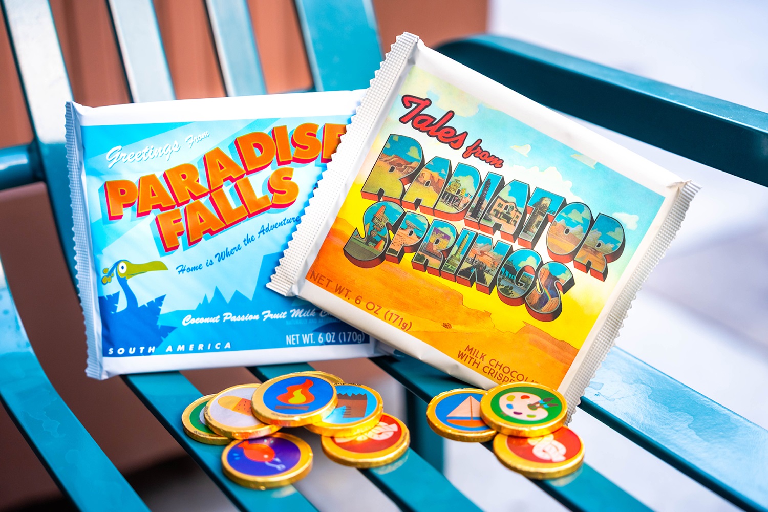 Cars-themed Milk Chocolate with crispy rice stars serve as a postcard of sports to Radiator Springs. Similarly, the Up- themed Coconut Passion Fruit Milk Chocolate sends greetings from Paradise Falls.