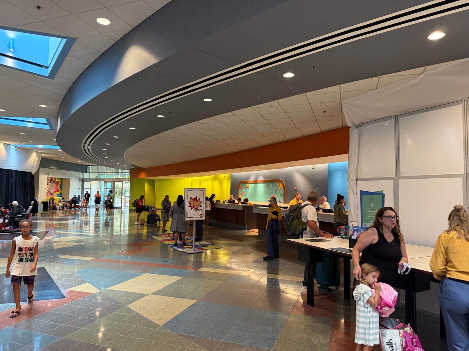 One section of the remodeled check-in area has appeared, with cast members helping guests in front of a simple mural full of 80s-inspired designs that seems like it might get something else added to the center of it – perhaps the Pop Century logo?