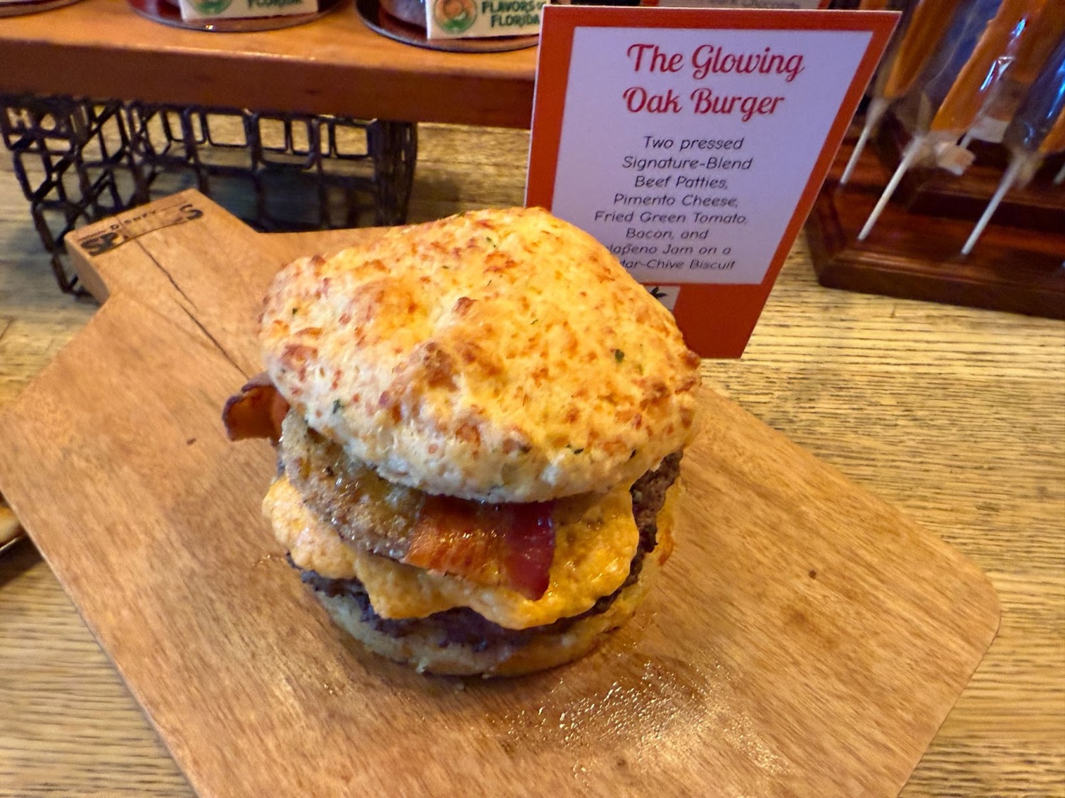 D-Luxe Burger has The Glowing Oak Burger – Two-pressed signature blend beef patties, pimento cheese, fried green tomato, bacon, and jalapeño jam on a cheddar-chive biscuit.