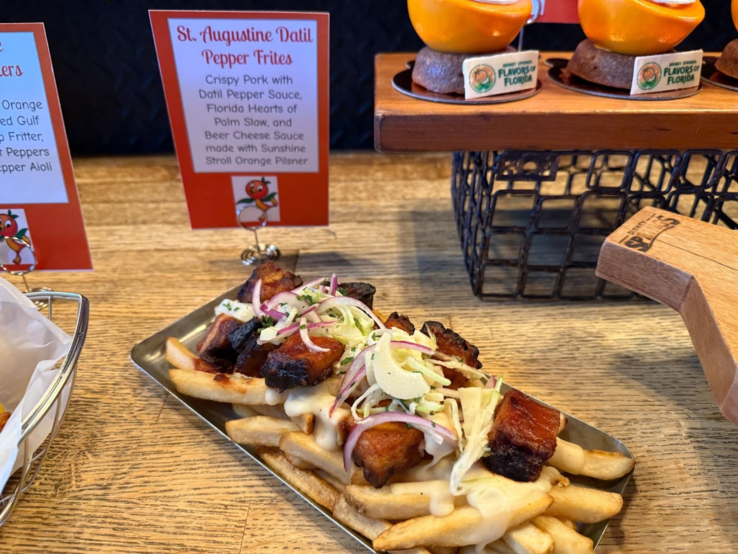 From The Daily Poutine comes St. Augustine Datil Pepper Frites – Crispy pork with Datil Pepper Sauce, Florida hearts of palm slaw, and beer cheese sauce made with Sunshine Stroll Orange Pilsner.