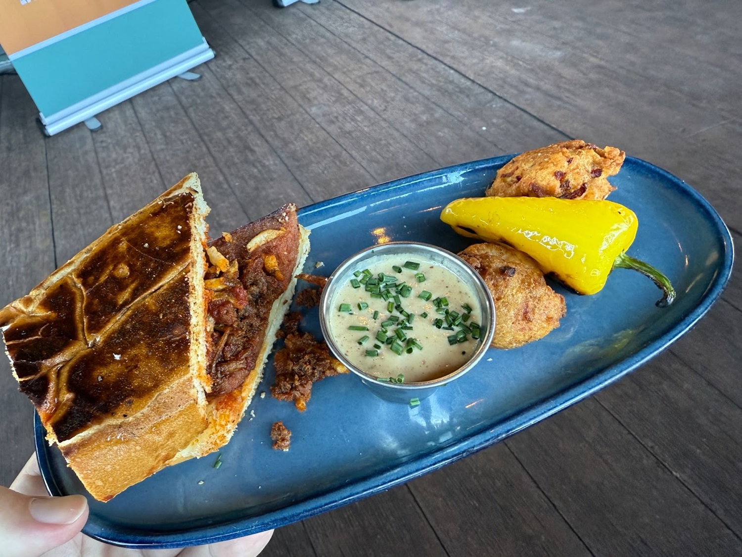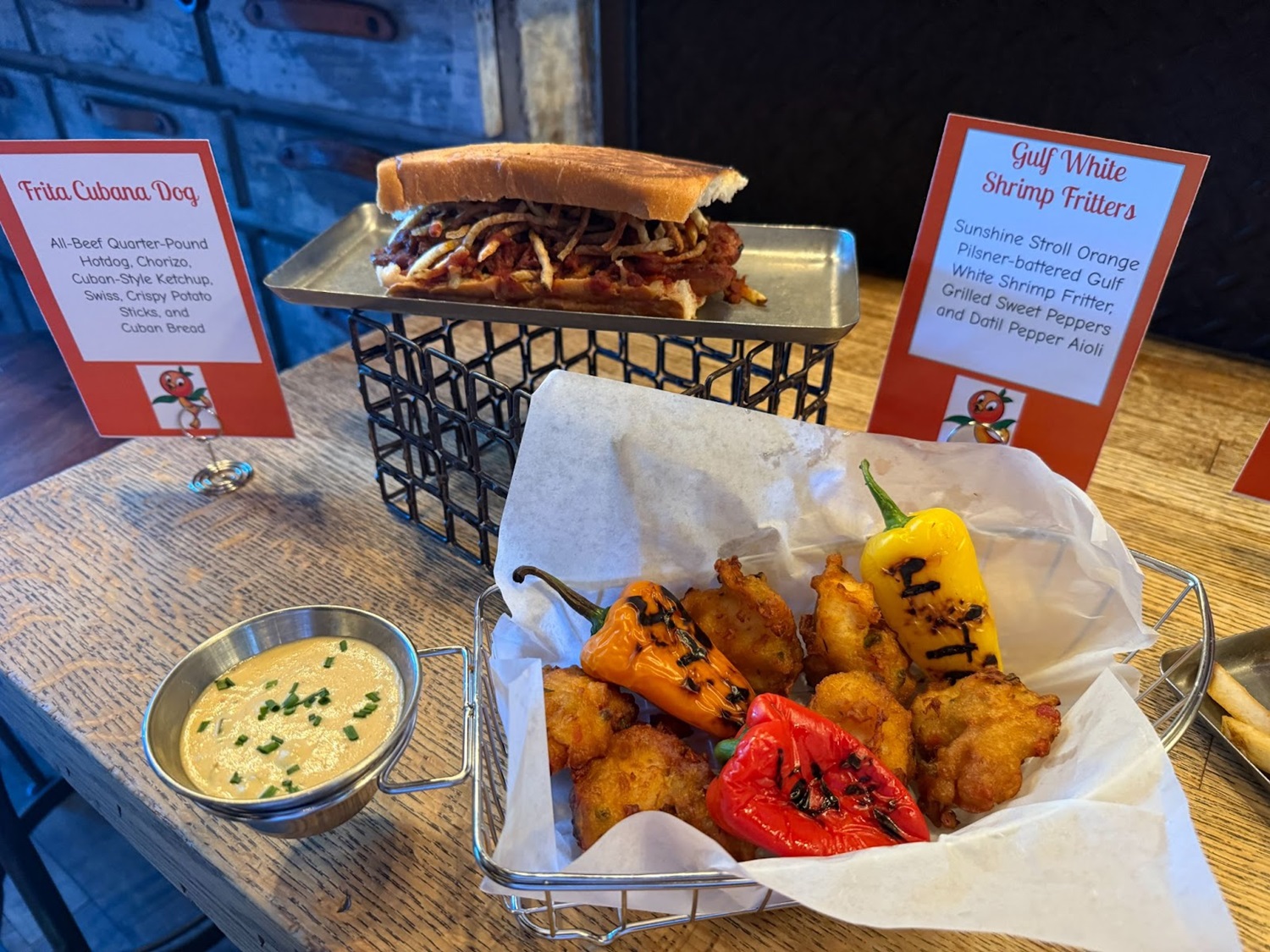 On to the Frita Cuban Dog from B.B. Wolf’s Sausage Co. and Gulf White Shrimp Fritters from Jock Lindsey’s Hanger Bar.