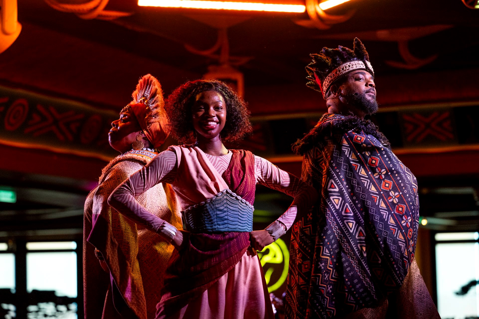 - During special intervals throughout your meal, the band and performers revisit beloved songs using authentic African instruments and theatrical props to represent the story and characters.