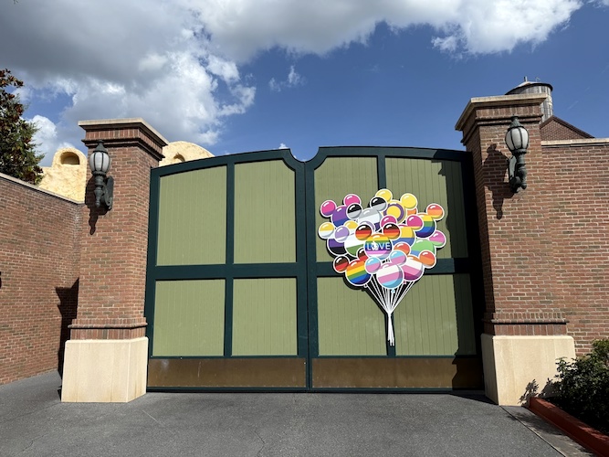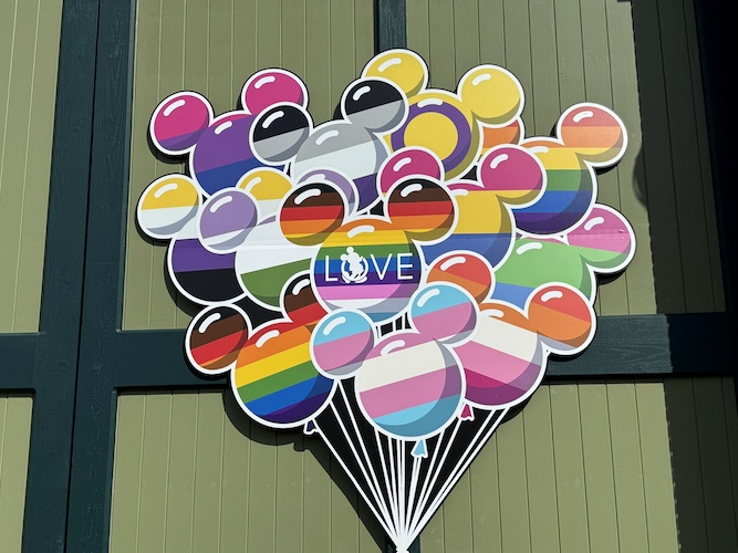 - The flat placard is placed on one of the park’s backstage access gates, and features Mickey balloons with patterns of several different LGBTQ+ flags.