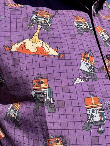 As you can see in the close-up photo below, the pattern depicts Chopper engaged in a number of familiar activities from Star Wars Rebels, including blasting off via his rocket booster, cuddling with and chasing around the Lothcat, and simply being his own memorably madcap self.
