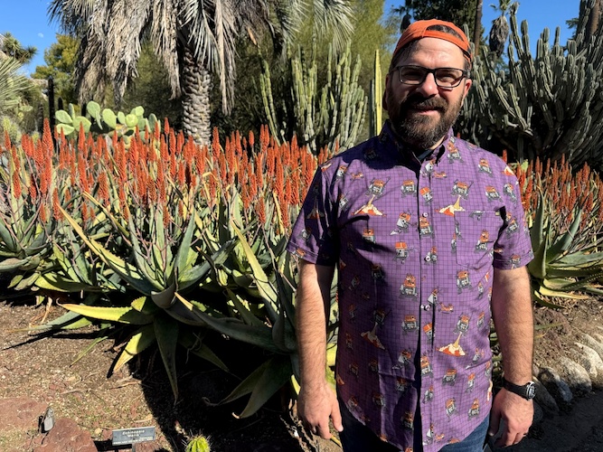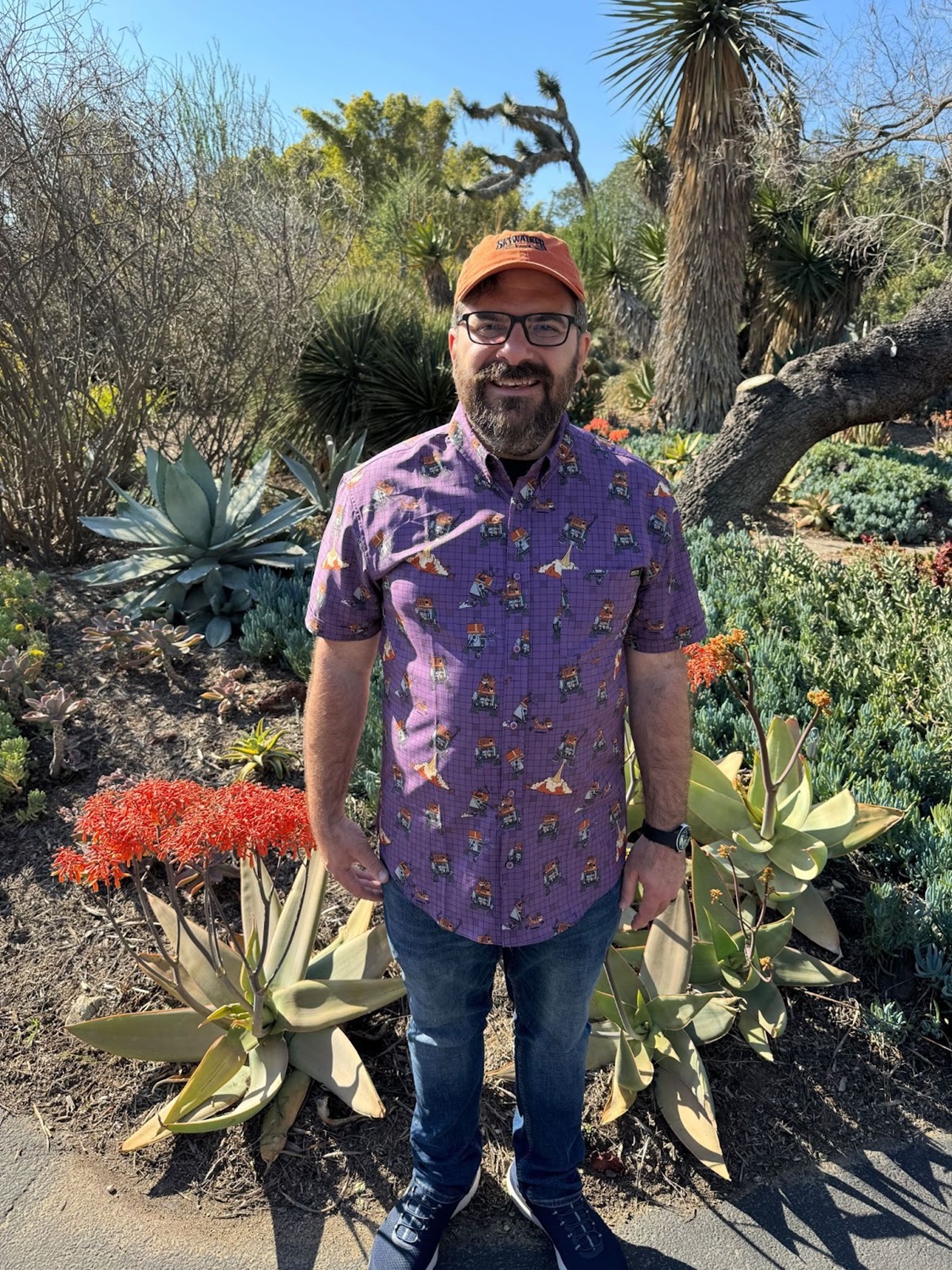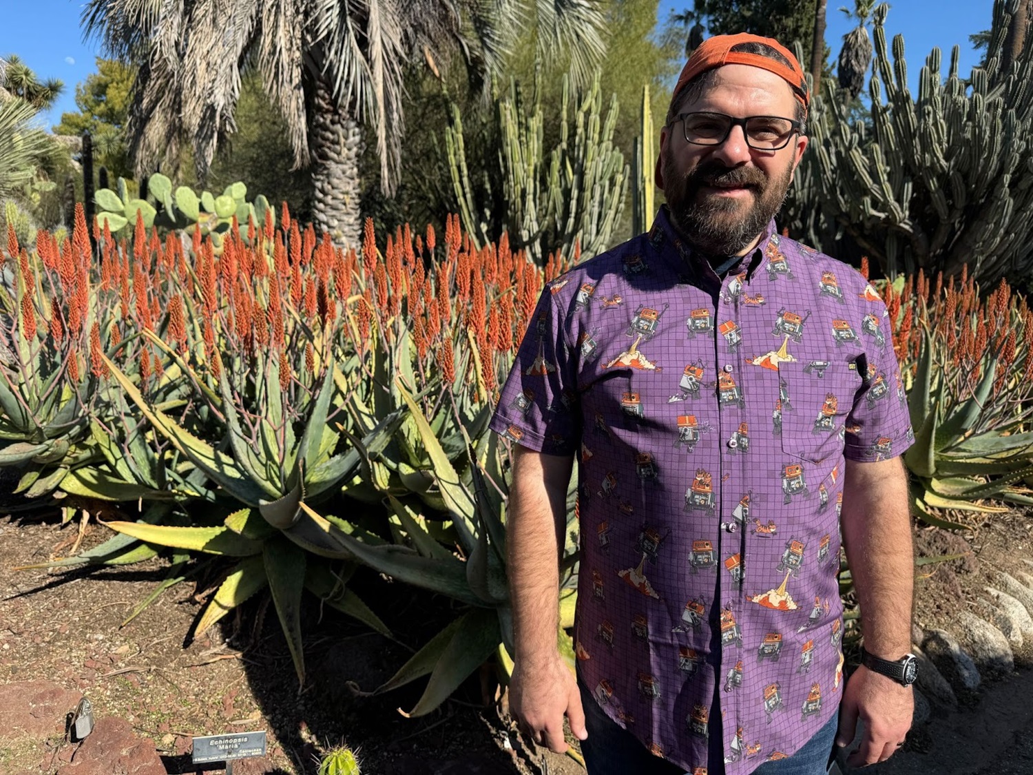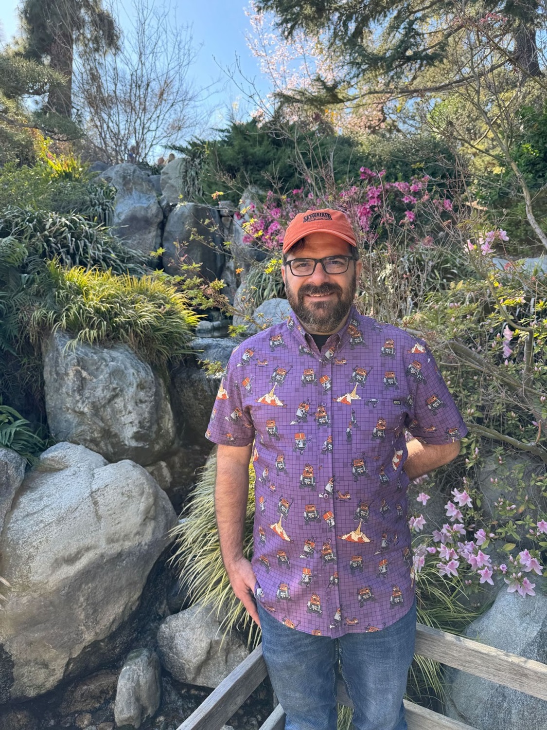 Yesterday we spent the day at the beautiful Huntington Library, Art Museum and Botanical Gardens here in Southern California, and I rightly figured that this would be the perfect opportunity to show off this colorful new shirt from RSVLTS. We even found a number of orange-hued flowers around the gardens to match the highlights on Chopper’s dome (not to mention the Lothcat’s fur) in the illustrations.