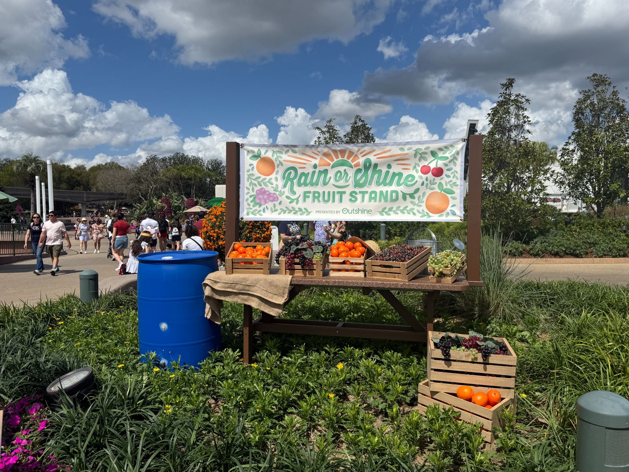 Check out EPCOT’s newest International Flower & Garden Festival addition with the Rain or Shine Fruit Stand Presented by Outshine.
