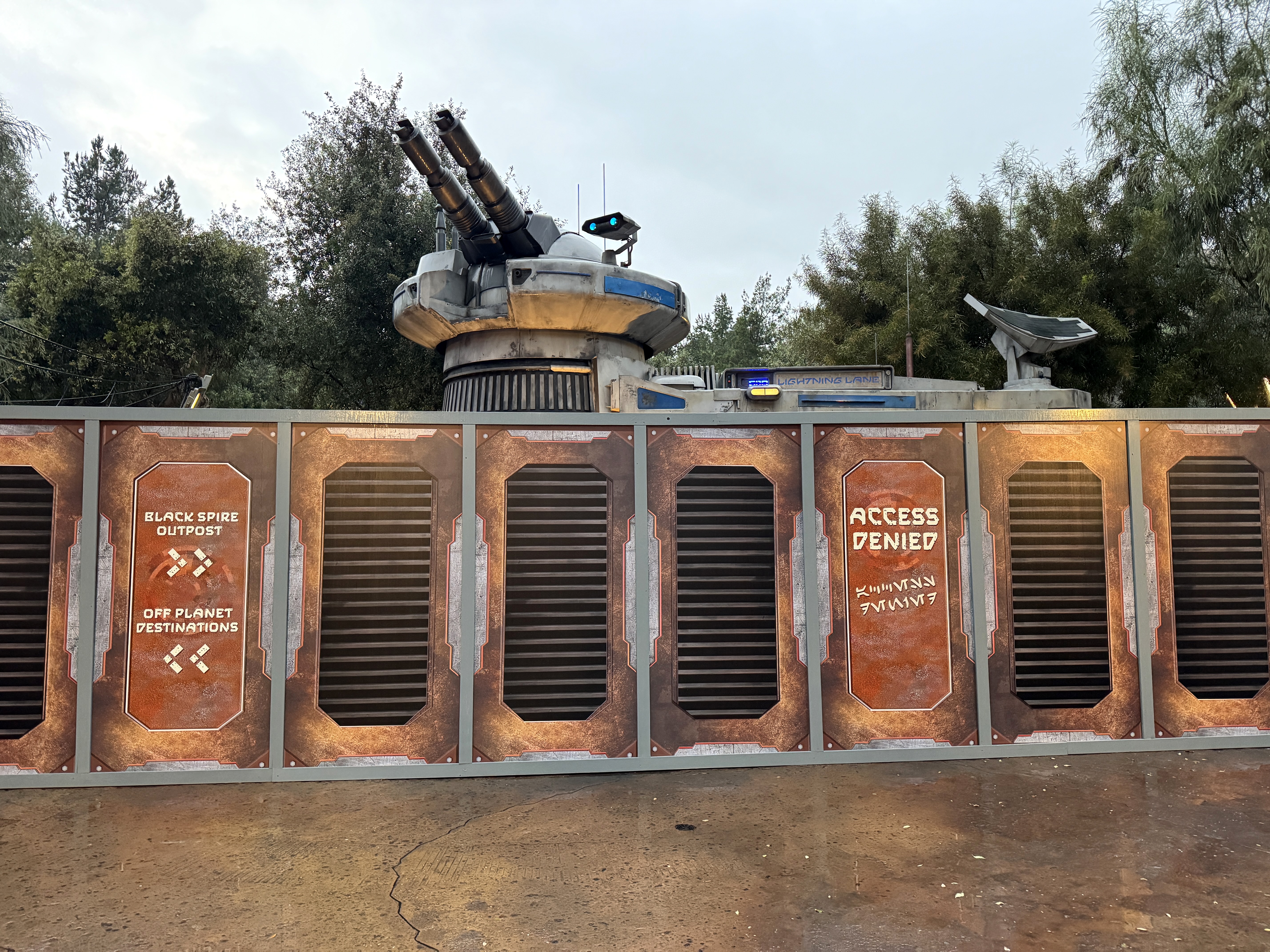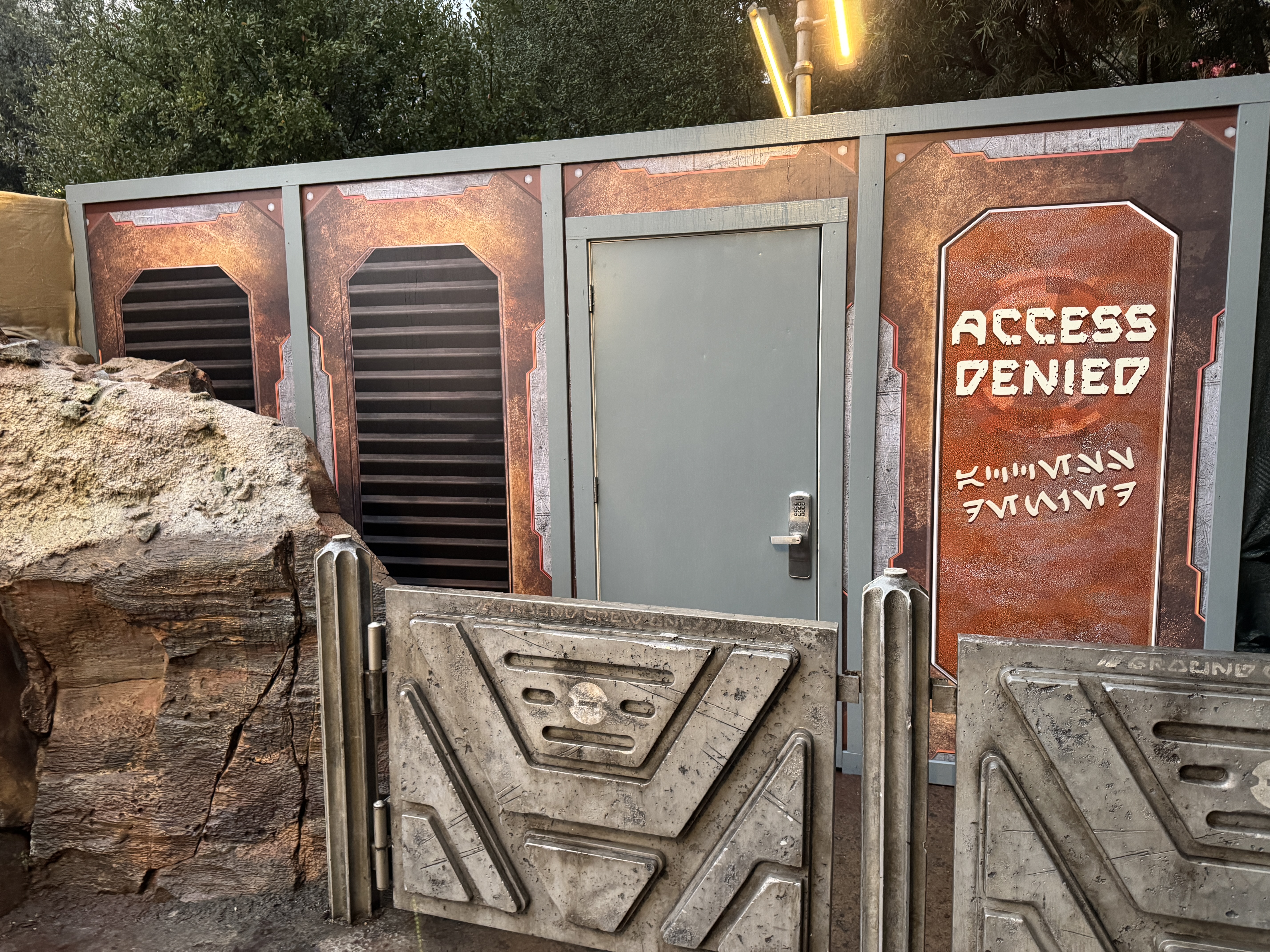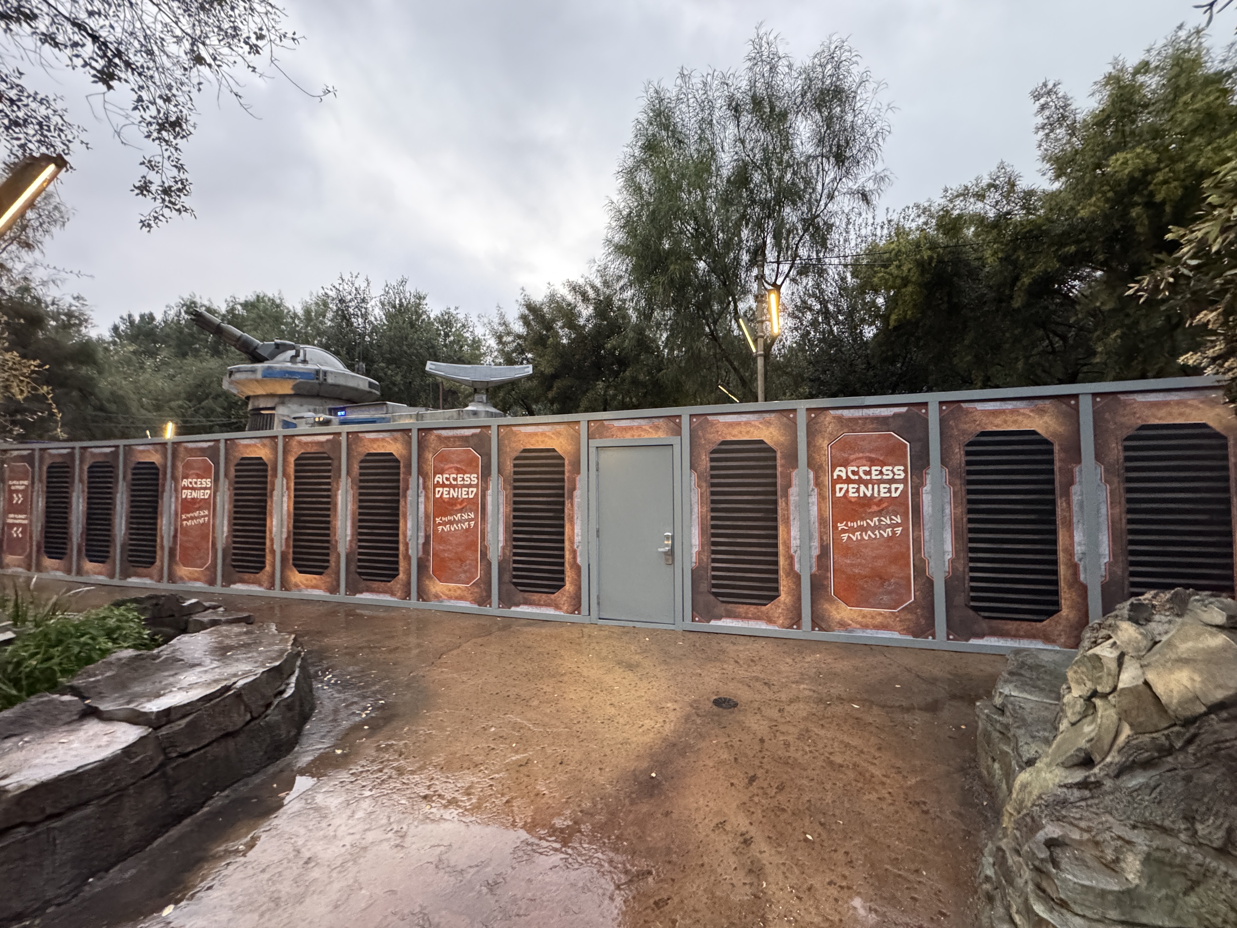 The themed art on the walls denies access to the attraction, while also directing guests to other facilities in Star Wars: Galaxy's Edge.