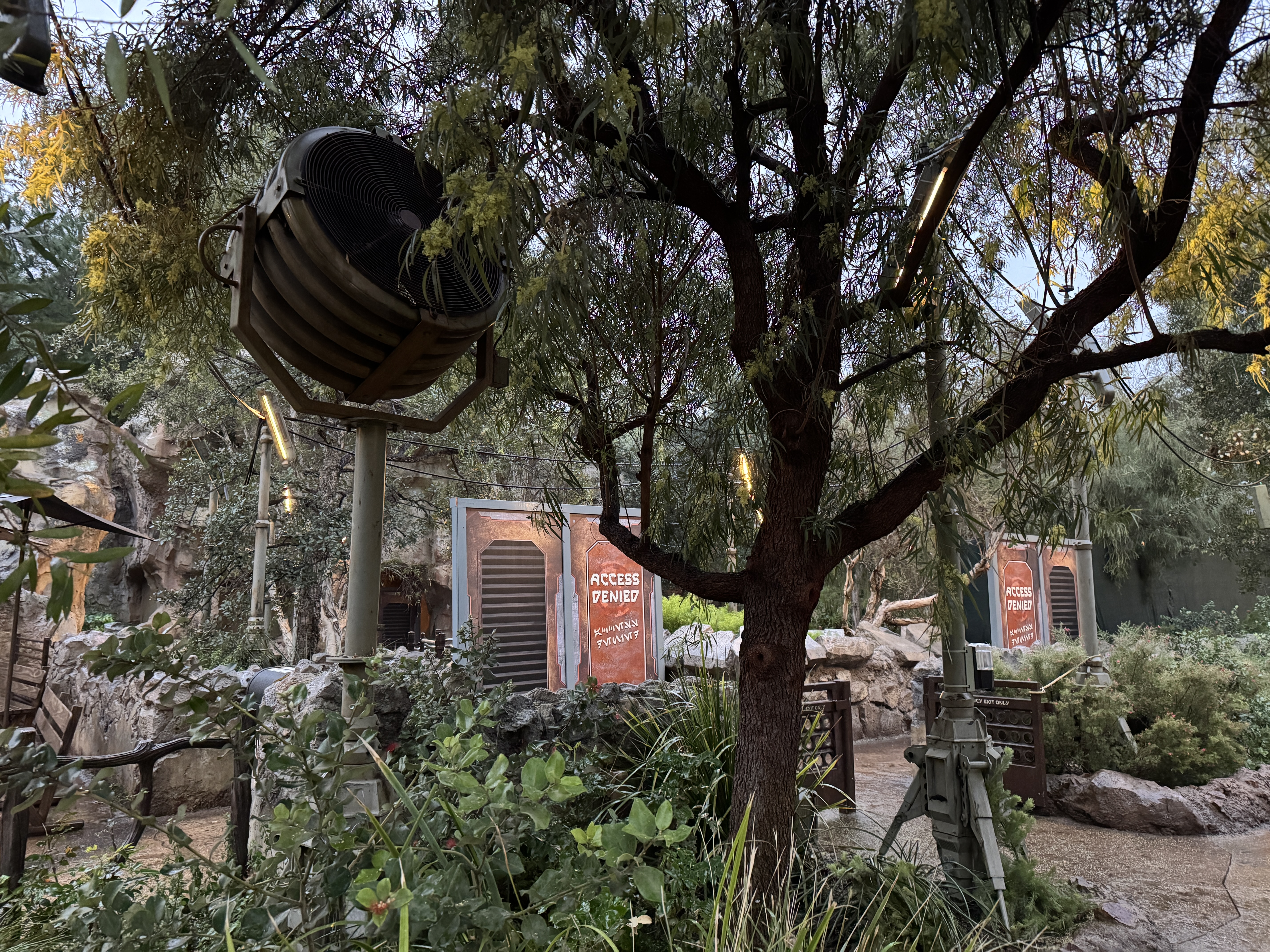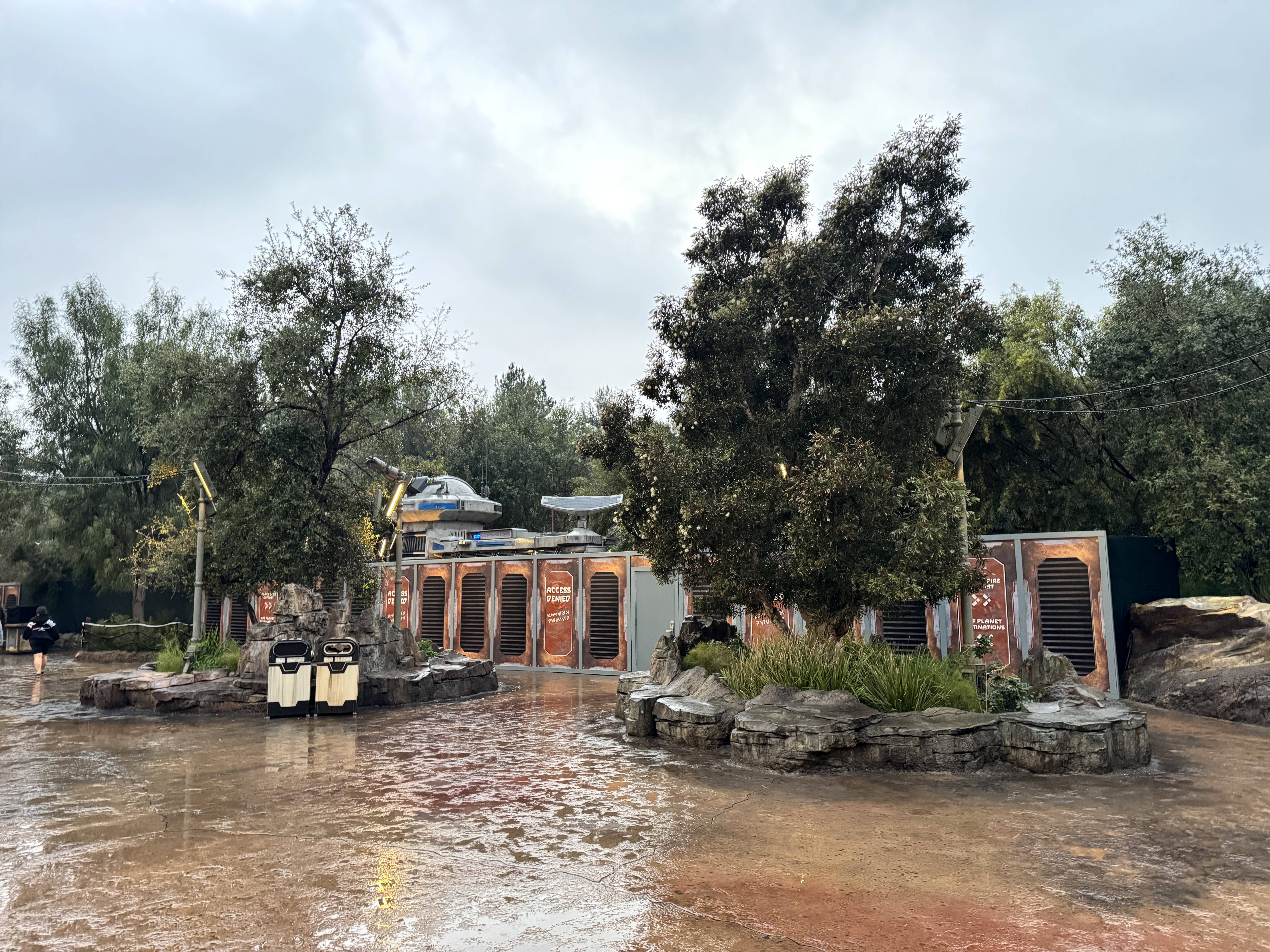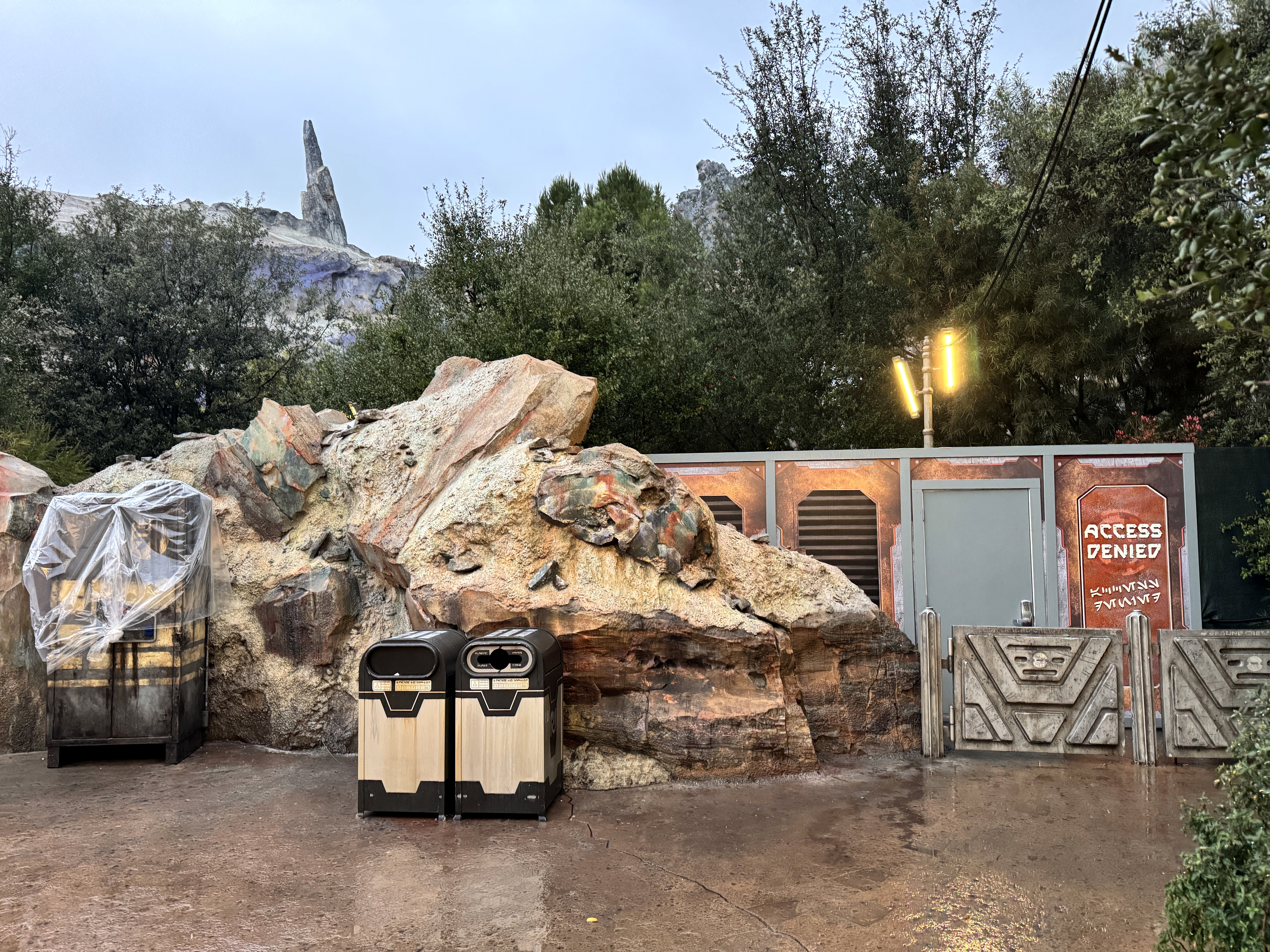 The themed art on the walls denies access to the attraction, while also directing guests to other facilities in Star Wars: Galaxy's Edge.