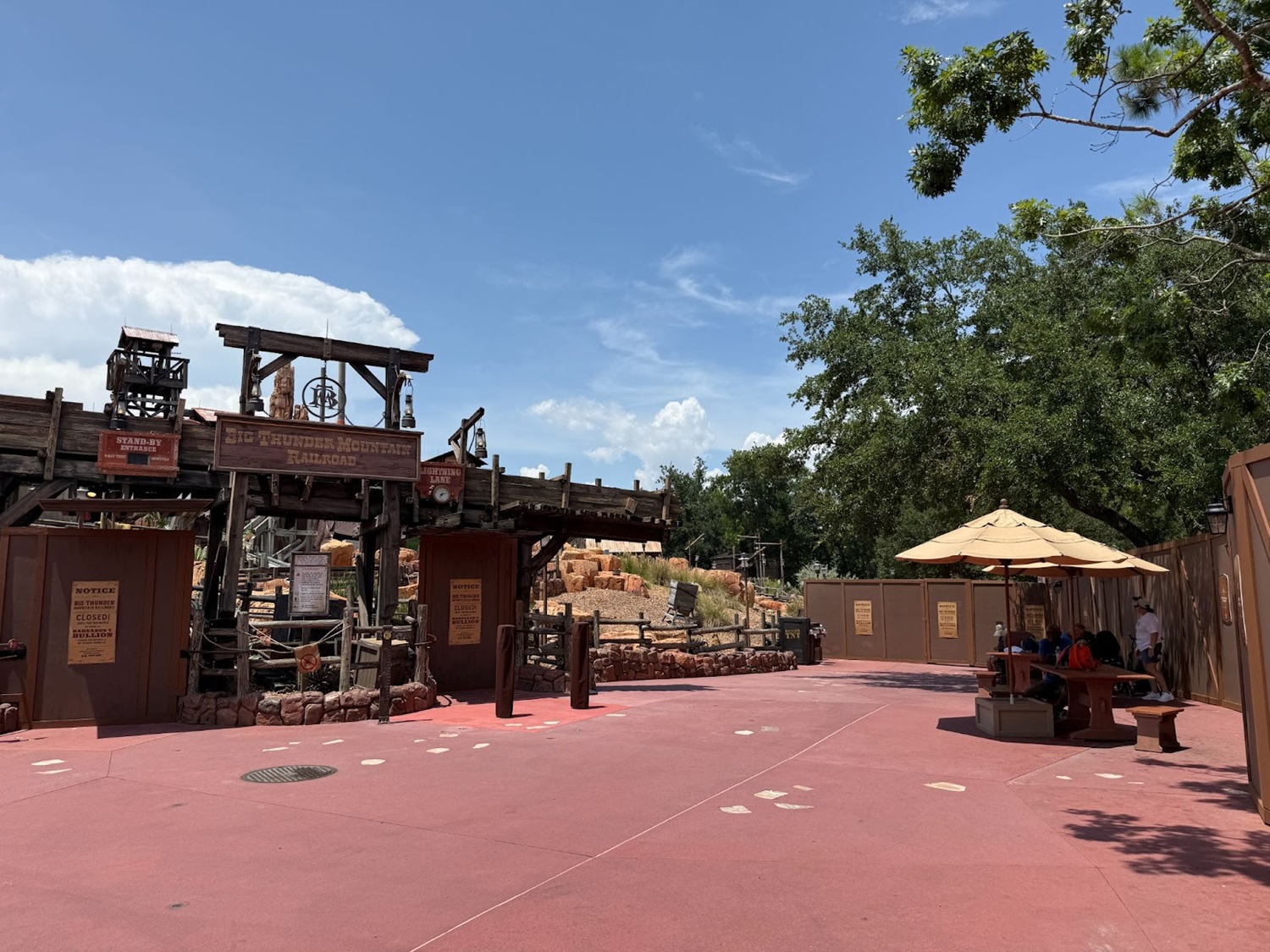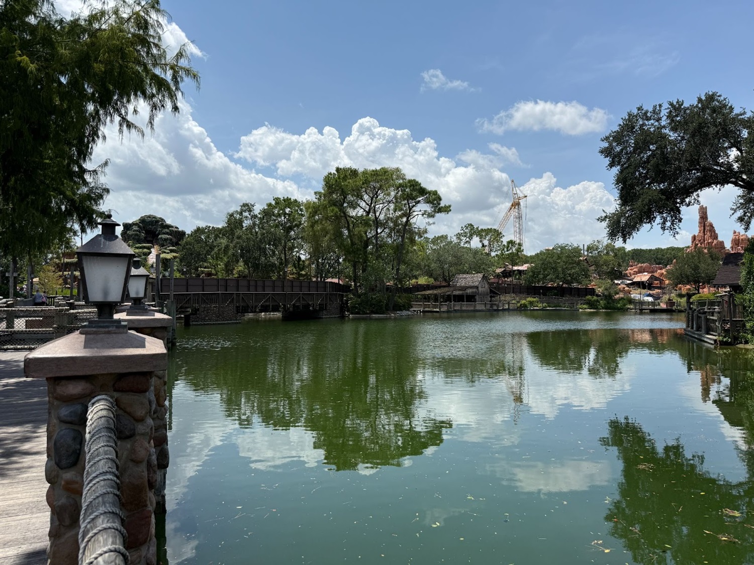 Things look almost normal when looking towards Tiana’s Bayou Adventure and Big Thunder Mountain, aside from a few new construction walls.