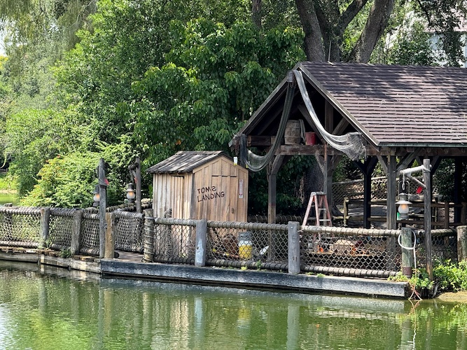 Equipment is being stored on one of the former Tom Sawyer Island docks.