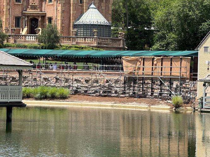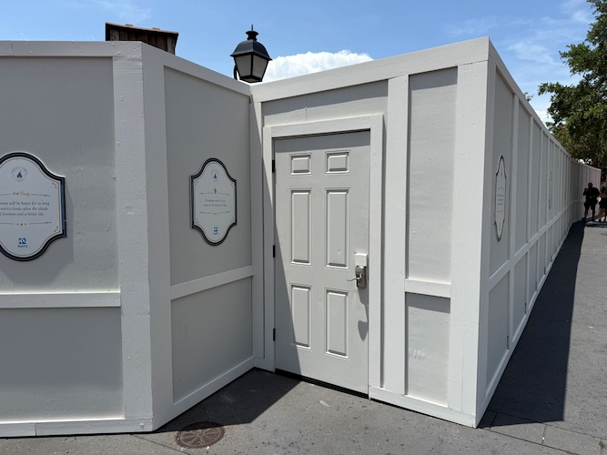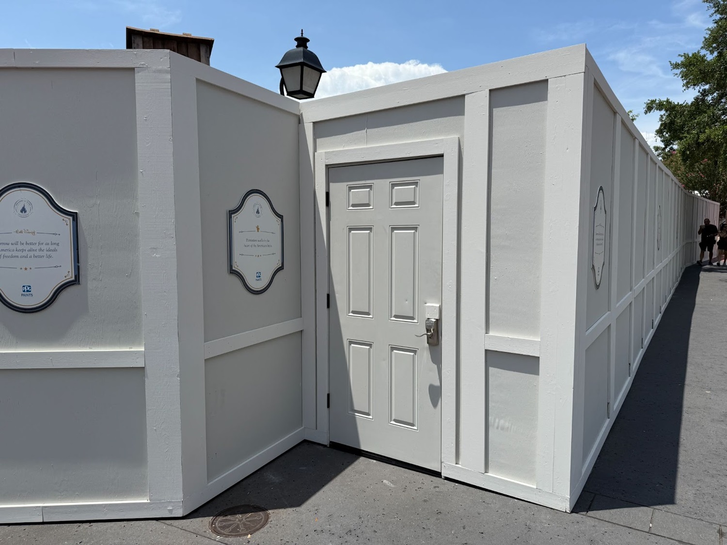 We’ll begin at the former Liberty Square Riverboat dock, which now has scrims up behind the ropes and rolling planters. When the attraction first closed, a single wall was up with a door, blocking access to the lower level of the Liberty Square Riverboat dock. Now, walls have expanded to the end of the bypass walkway along the river’s edge.