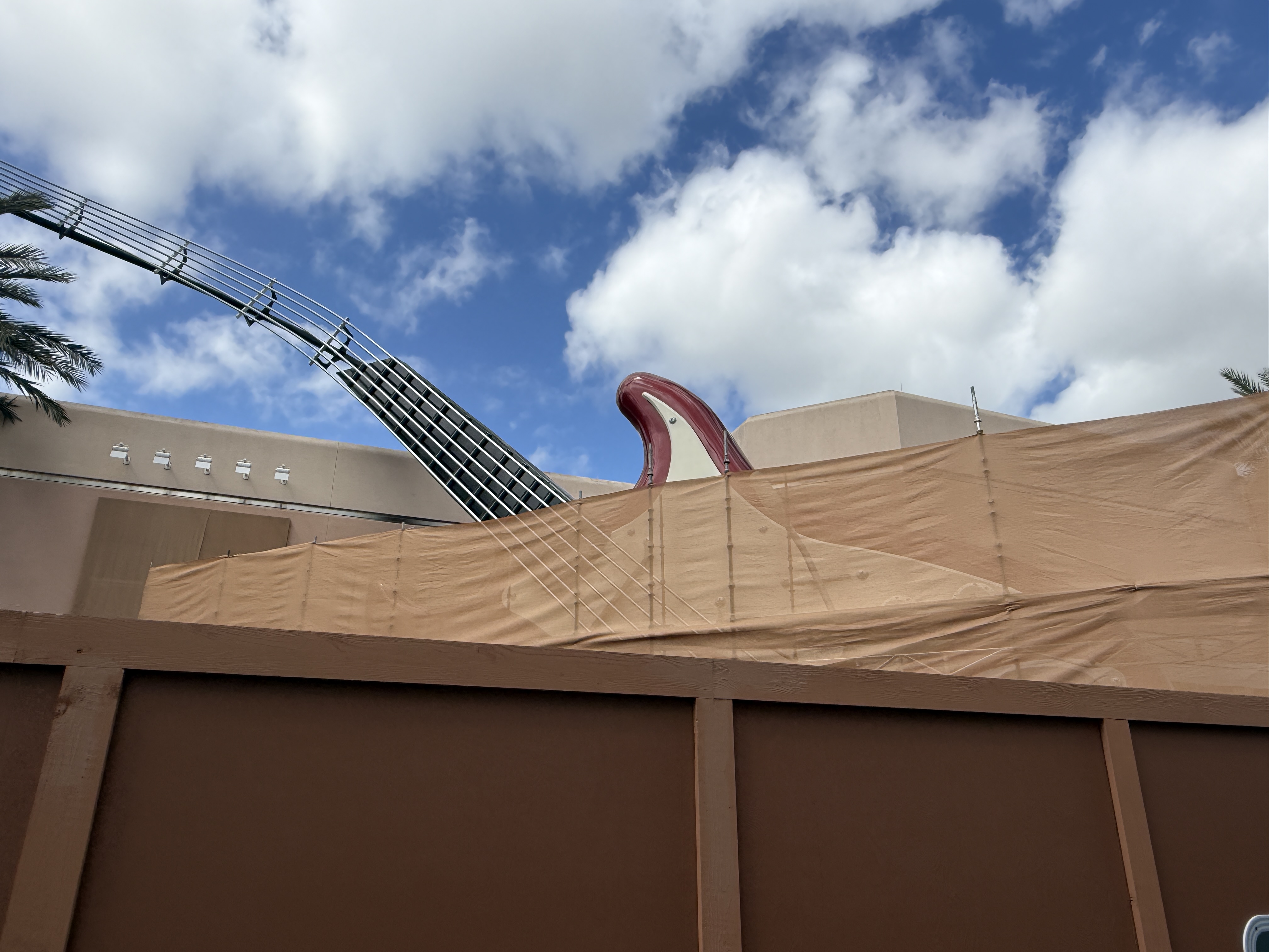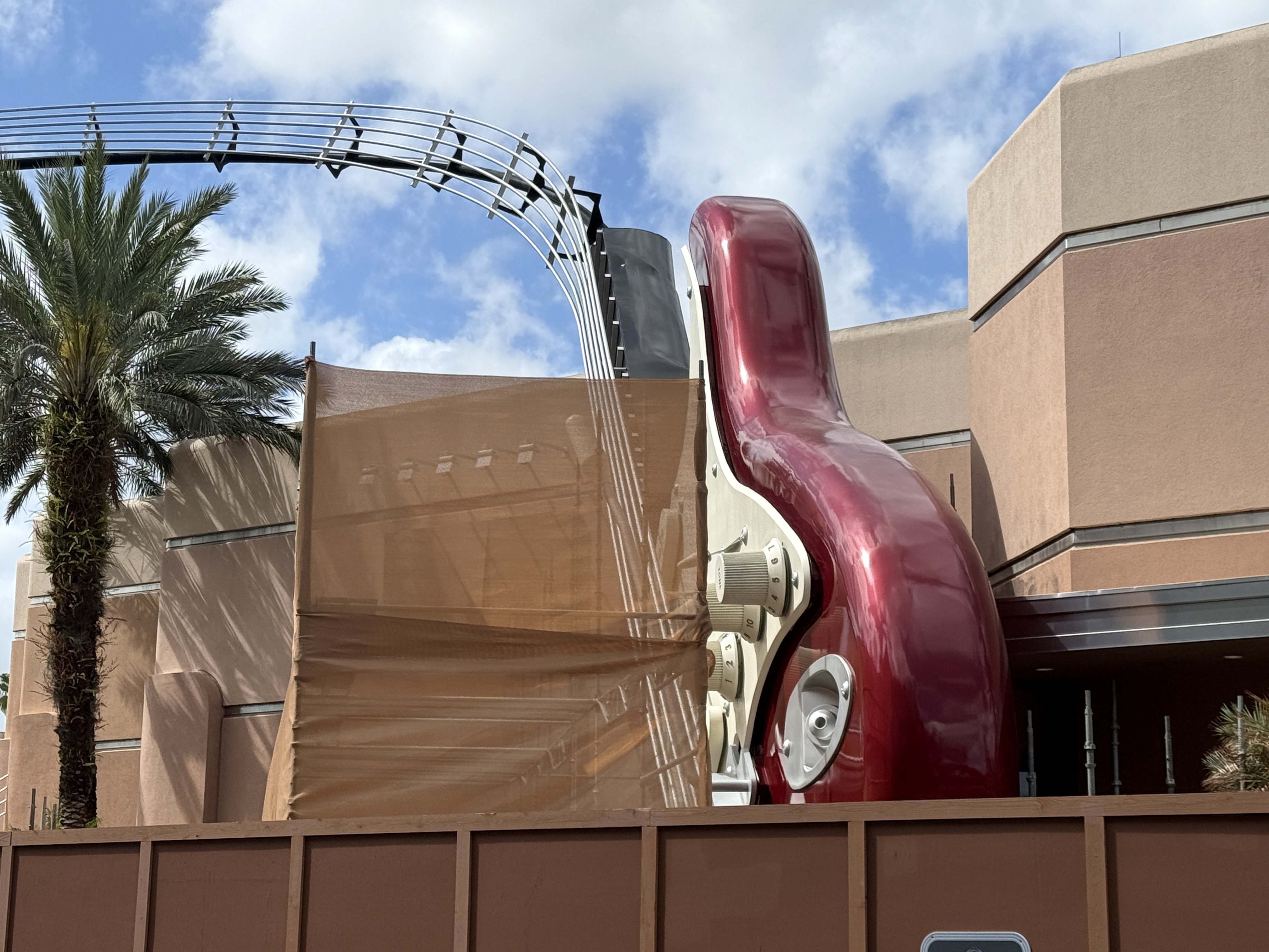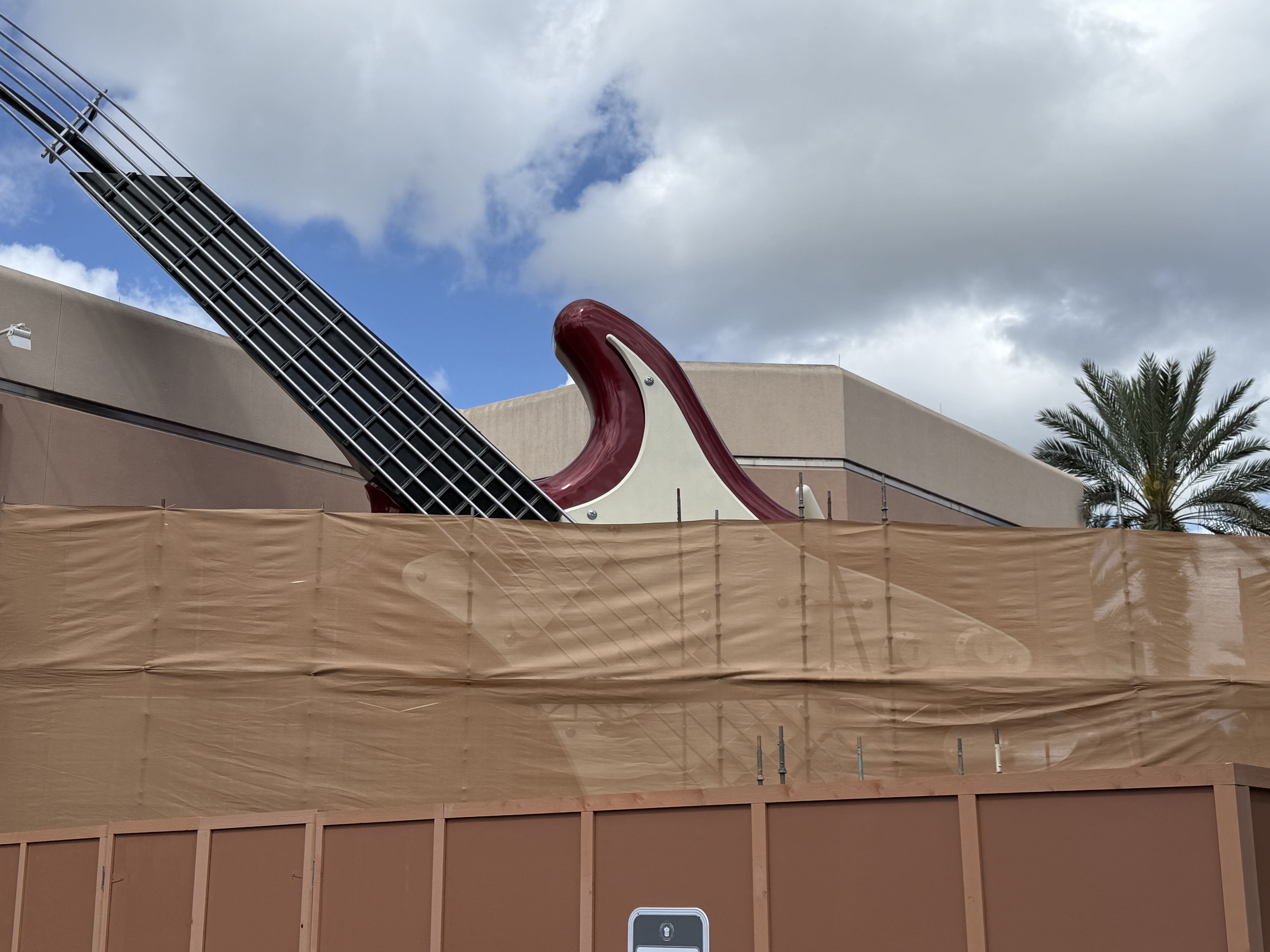 - In addition to grabbing those photos today, Laughing Place reporter Luke Manning also stopped by the attraction's giant guitar, which is now covered by construction walls and a scrim as it to begins to get a new paint job with a fresh color scheme.